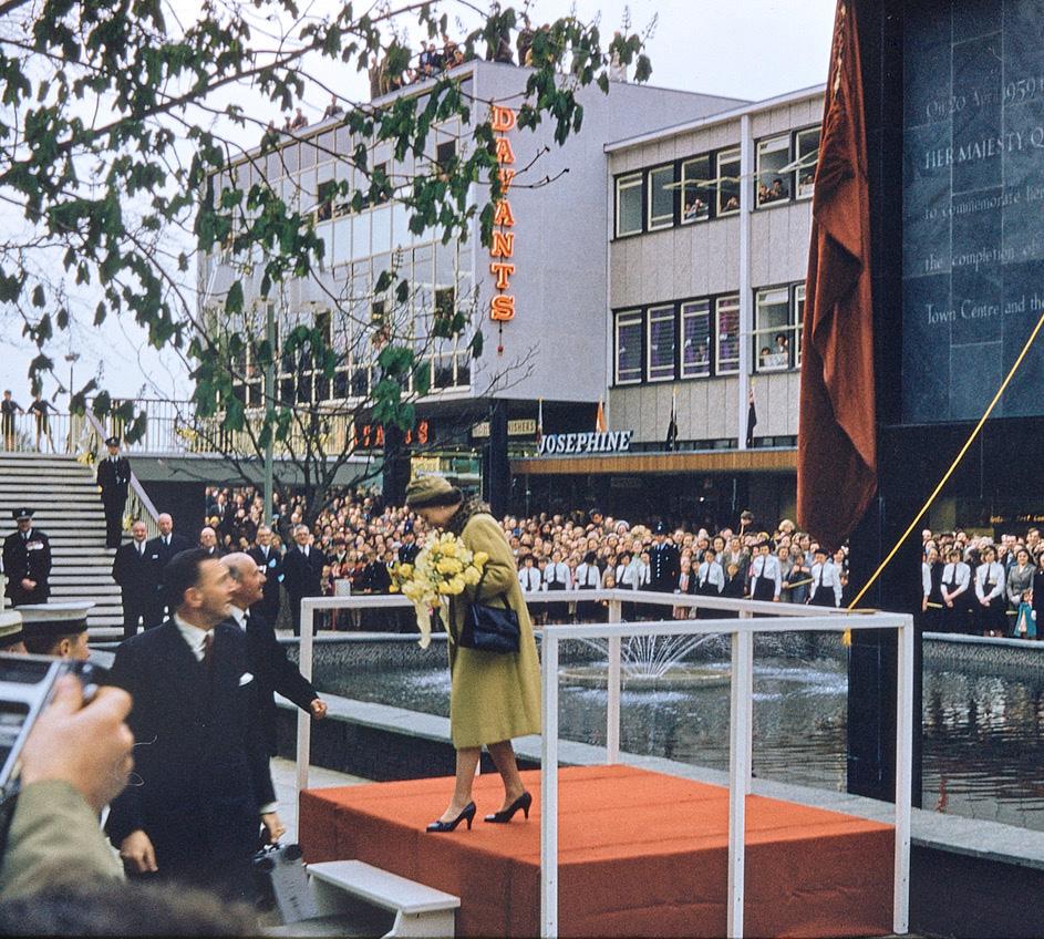 The Queen’s visit in 1959asked to produce detailed drawings for a scheme with a central road (down what is now Queensway) that would allow for conversion to a pedestrian way at a future date. But local people were concerned about the increase in traffic accidents and in January 1954, they called an open meeting and passed a unanimous resolution asking for a pedestrian-only town centre. With all the new evidence provided, the ministry was convinced and the plans were revised.