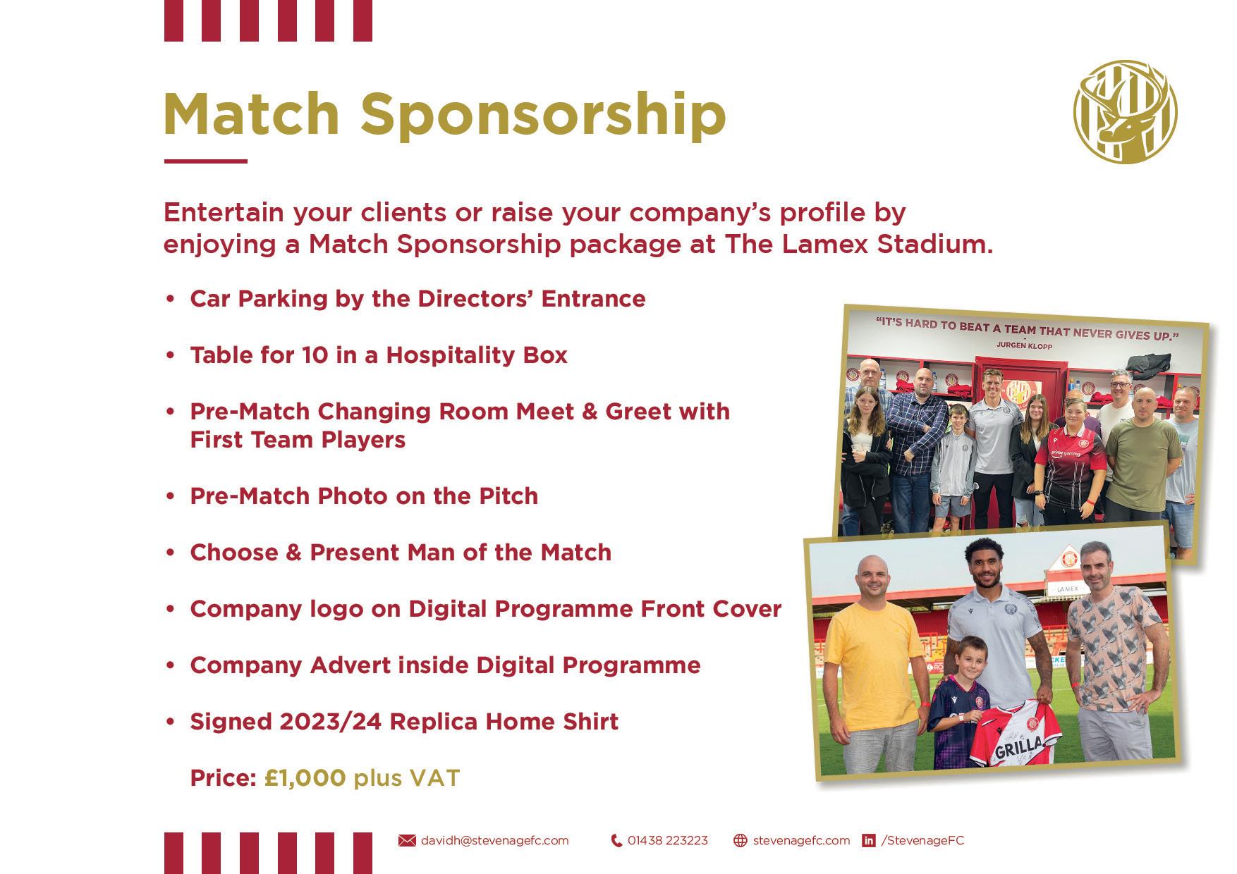 We still have match sponsorship opportunities and hospitality available for some of our matches this season, so if you are interested in watching a home game in one of our corporate boxes or suites or you would like more information on the Boro Business Club, please get in touch with David Hoskins, Head of Commercial davidh@stevenagefc.com. Finally, it’s great to see the progress the team has been making this season and to see us flourishing at the top end of the table. Huge credit to Steve, the coaching team and the players for this season’s great start and performances. I hope you enjoy today’s match, a historic moment with a first meeting between us, so get behind the team as they really appreciate your support.