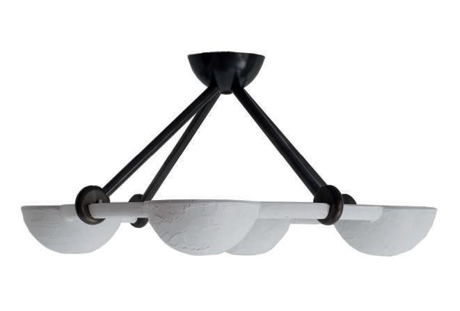 Sculptural plaster-wrapped metal frame with four uplift domes. Available in white or bronze-verdigris painted finish and custom height.