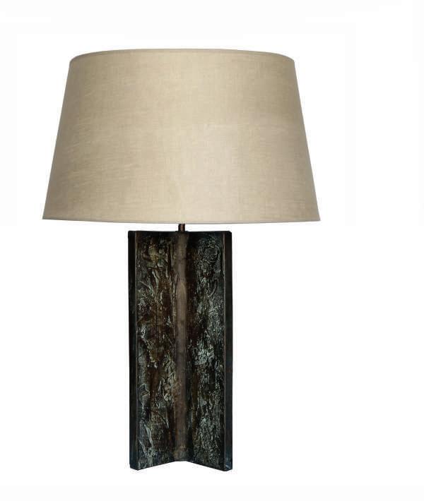 H 76cm with 20” tapered drum shade, base D 31cm Cast-plaster lamp in white or bronze-verdigris painted finish.