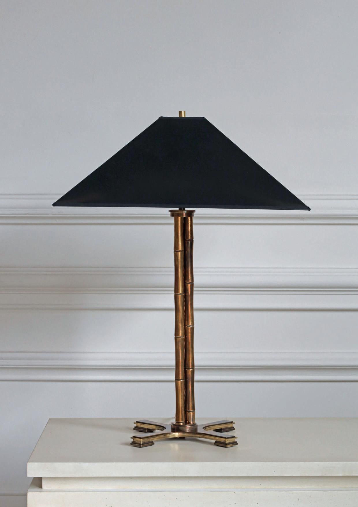 H 168cm with 18” empire shade, base 22 x 22cm Cast bronze in polished or verdigris finish.