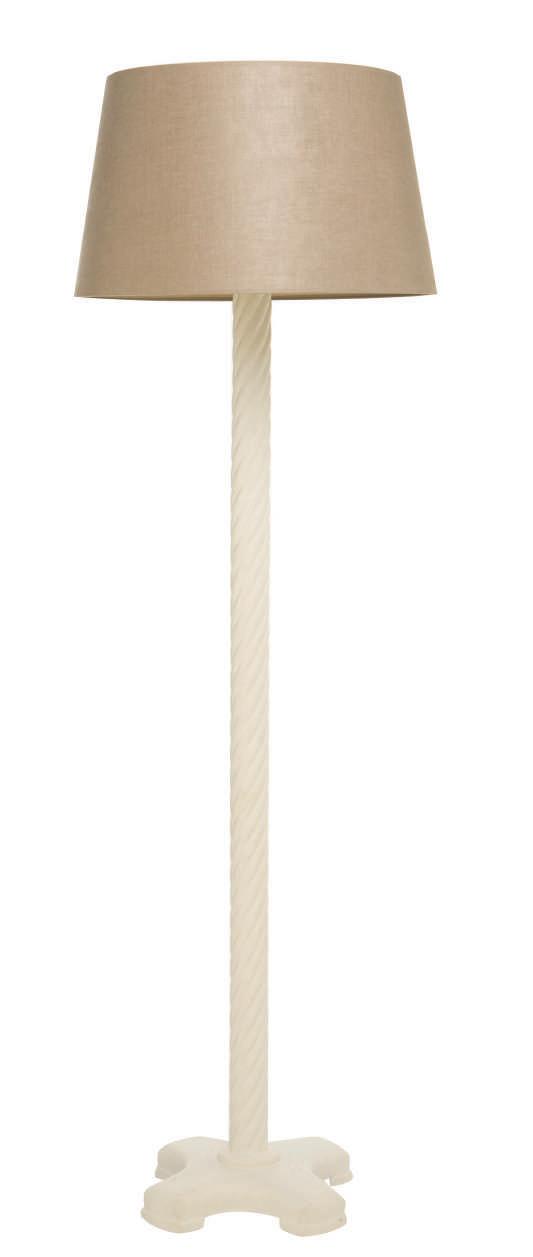 H 185cm with 20” tapered drum shade, base 30 x 30cm Cast-fibreglass-plaster lamp with spiral design.