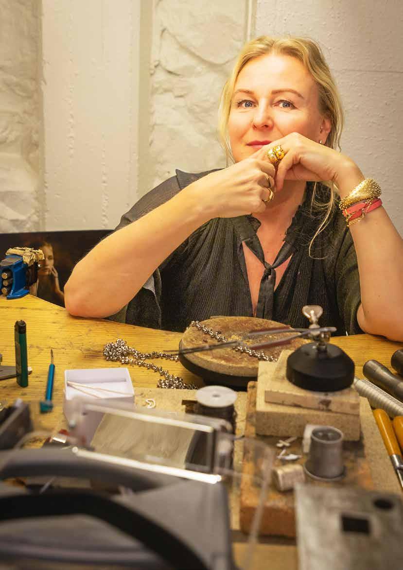 Från tiden hon tillverkade allt vid den egna bänken har hon kvar många stamkunder. Dem hjälper hon om de vill beställa unika smycken eller om något måste lagas. Ateljé och verkstad har hon alltid haft. Enskild firma startade hon 2006. Och tio år senare startade hon ett aktiebolag och började på allvar arbeta med större kollektioner.