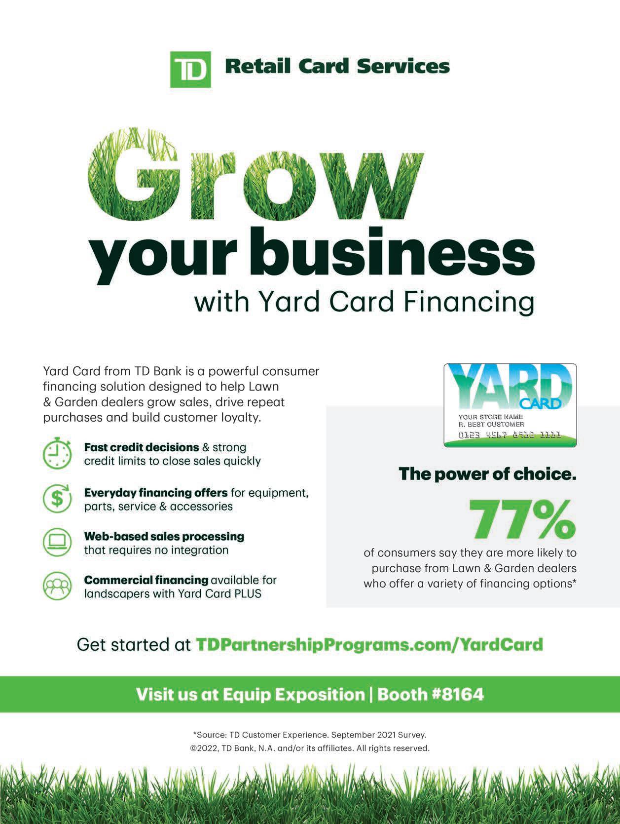 TD BANK—Yard Card from TD Bank is a powerful consumer and commercial financing payment solution designed to help lawn & garden dealers grow sales, drive repeat purchases and build customer loyalty. In today’s marketplace, your customers expect payment options, so offering a financing program is one of the smartest decisions your dealership can make.