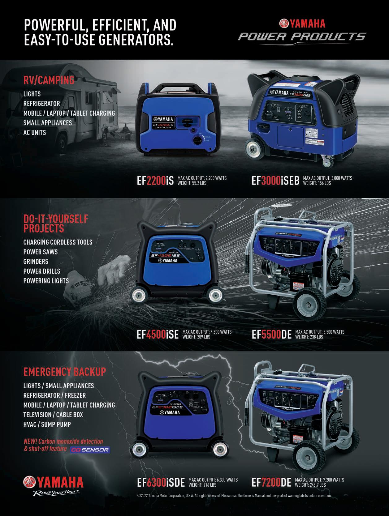 YAMAHA—The EF2200iS delivers 2,200 watts of power to meet the demands of today’s most popular RVs and trailers, built with Yamaha premium inverter technology, delivering clean power for sensitive electronics.
