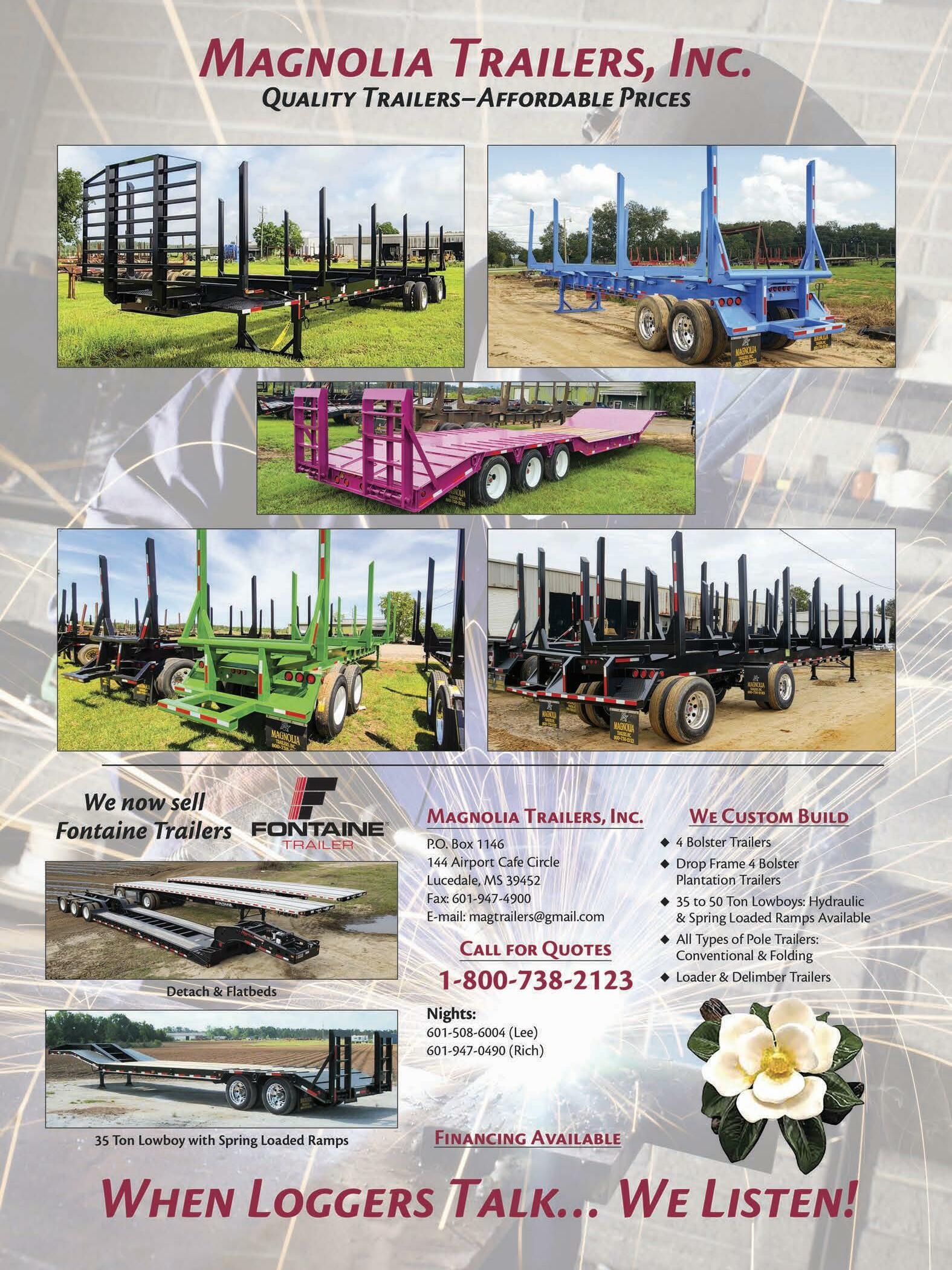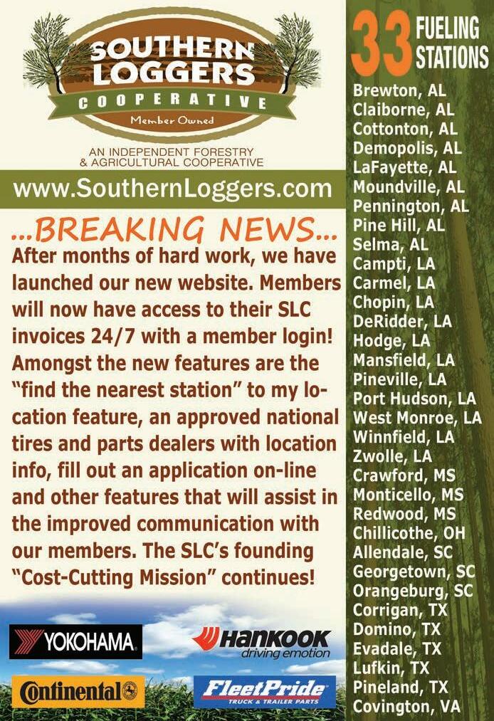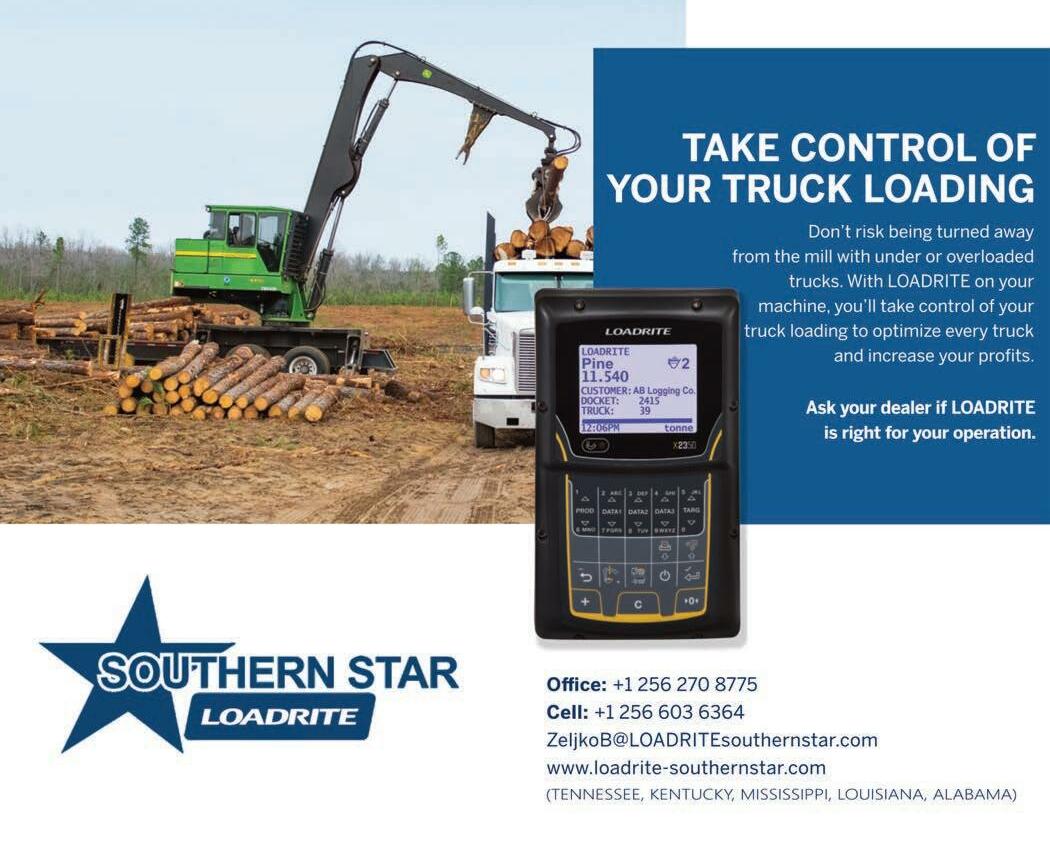 Southern Loggin’ Times (ISSN 0744-2106) is published monthly by Hatton-Brown Publishers, Inc., 225 Hanrick St., Montgomery, AL 36104. Subscription Information—SLT is sent free to logging, pulpwood and chipping contractors and their supervisors; managers and supervisors of corporate-owned harvesting operations; wood suppliers; timber buyers; wood procurement and land management officials; industrial forestry purchasing agents; wholesale and retail forest equipment representatives and forest/logging association personnel in the U.S. South. See form elsewhere in this issue. All non-qualified U.S. subscriptions are $65 annually; $75 in Canada; $120 (Airmail) in all other countries (U.S. funds). Single copies, $5 each; special issues, $20 (U.S. funds). Subscription Inquiries TOLL-FREE 800-669-5613; Fax 888-611-4525. Go to www.southernloggintimes.com and click on the subscribe button to subscribe/renew via the web. All advertisements for Southern Loggin’ Times magazine are accepted and published by Hatton-Brown Publishers, Inc. with the understanding that the advertiser and/or advertising agency are authorized to publish the entire contents and subject matter thereof. The advertiser and/or advertising agency will defend, indemnify and hold Hatton-Brown Publishers, Inc. harmless from and against any loss, expenses, or other liability resulting from any claims or lawsuits for libel violations or right of privacy or publicity, plagiarism, copyright or trademark infringement and any other claims or lawsuits that may arise out of publication of such advertisement. Hatton-Brown Publishers, Inc. neither endorses nor makes any representation or guarantee as to the quality of goods and services advertised in Southern Loggin’ Times. Hatton-Brown Publishers, Inc. reserves the right to reject any advertisement which it deems inappropriate. Copyright ® 2023. All rights reserved. Reproduction in whole or in part without written permission is prohibited. Periodicals postage paid at Montgomery, Ala. and at additional mailing offices. Printed In USA. POSTMASTER: Send address changes to: Southern Loggin’ Times, P.O. Box 2419, Montgomery, AL 36102-2419