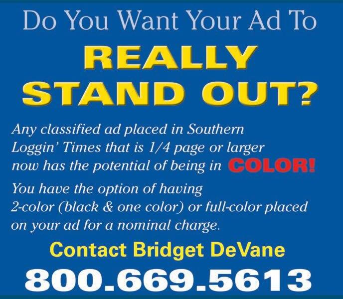 CONTACT: Call Bridget DeVane at 334-699-7837, 800-669-5613, email bdevane7@hotmail.com or visit www.southernloggintimes.com