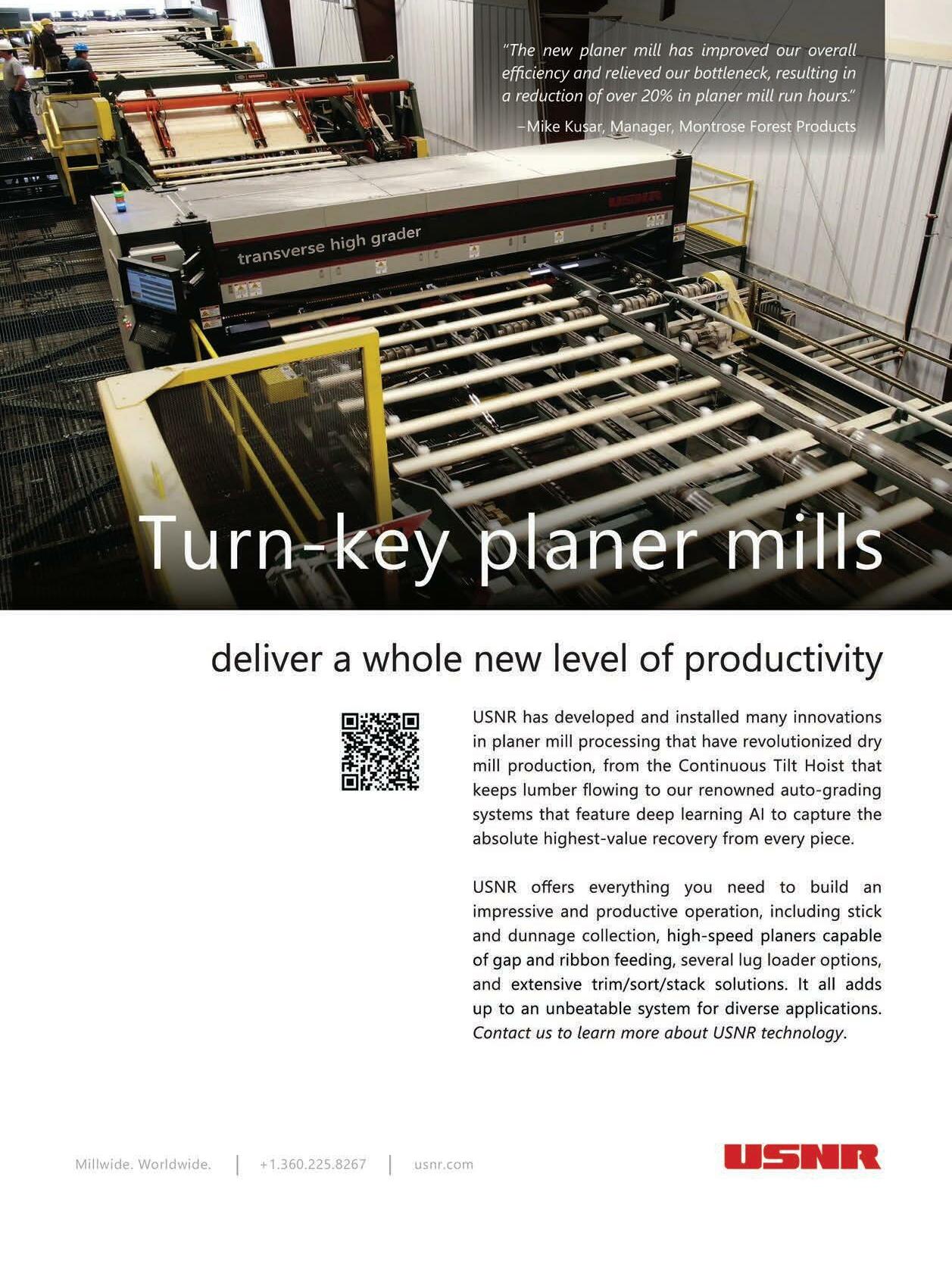 E-mail: murray.brett@abasol.net Processing (ISSN 0885-906X, USPS 395-850) is published 11 times annually (monthly except Jan./Feb.) by Hatton-Brown Publishers, Inc., 225 Hanrick St., Montgomery, AL 36104. Subscription Information—TP is free to qualified owners, operators, managers, purchasing agents, supervisors, foremen and other key personnel at sawmills, pallet plants, chip mills, treating plants, specialty plants, lumber finishing operations, corporate industrial woodlands officials and machinery manufacturers and distributors in the U.S. All non-qualified U.S. Subscriptions are $55 annually: $65 in Canada; $95 (Airmail) in all other countries (U.S. Funds). Single copies, $5 each; special issues, $20 (U.S. funds). Subscription Inquiries— TOLL-FREE: 800-6695613; Fax 888-611-4525. Go to www.timberprocessing.com and click on the subscribe button to subscribe/renew via the web. All advertisements for Timber Processing magazine are accepted and published by Hatton-Brown Publishers, Inc. with the understanding that the advertiser and/or advertising agency are authorized to publish the entire contents and subject matter thereof. The advertiser and/or advertising agency will defend, indemnify and hold any claims or lawsuits for libel violations or right of privacy or publicity, plagiarism, copyright or trademark infringement and any other claims or lawsuits that may arise out of publication of such advertisement. Hatton-Brown Publishers, Inc. neither endorse nor makes any representation or guarantee as to the quality of goods and services advertised in Timber Processing. Hatton-Brown Publishers, Inc. reserves the right to reject any advertisement which it deems inappropriate. Copyright ® 2022. All rights reserved. Reproduction in whole or part without written permission is prohibited. Periodicals postage paid at Montgomery, Ala. and at additional mailing offices. Printed in U.S.A.