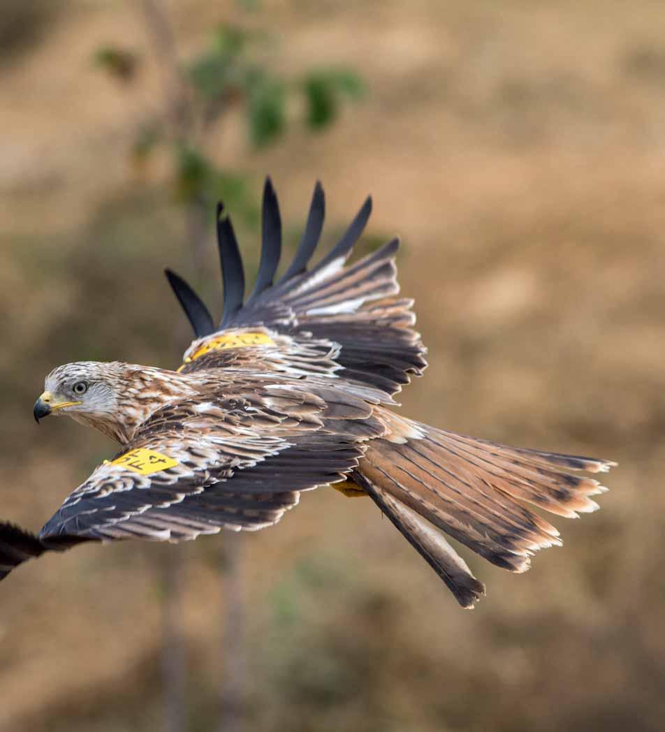 Ein adulter Rotmilan mit einem kleinen GPS-Sender, der wie ein Rucksack befestigt wurde.
