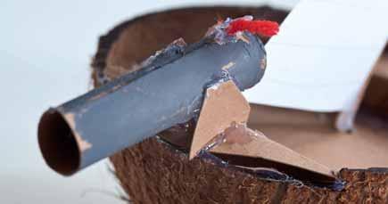 kleine, kreisförmige Stellen. Hier ist die Nuss besonders weich und du kannst sie leicht mit dem Handbohrer anbohren und die Kokosmilch ablaufen lassen. Sammle sie in einem Glas –Kokosmilch schmeckt lecker.