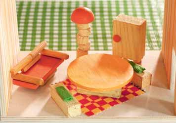 von Holzleisten und Sperrholzplatten, Rundhölzchen, Holzscheiben, Holzdübel, Holzhalbkugeln, Stoffreste, Farben, Leim, bunte Papierchen, Draht, Zahnstocher ... Überlege dir, wie sich aus diesen einfachen Zutaten Möbel bauen lassen – Schränke, Betten, Tische, Küchenzeile, Sonnenschirm und alles, was dir einfällt.