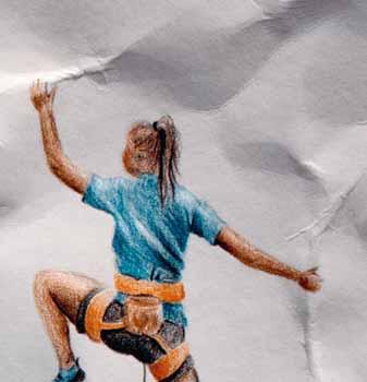 Dort, wo die Knickboxerin mit dem Fuß hintritt, wird das Papier zusammengeschoben. Um die Kraft des Trittes zu betonen, darf es an dieser Stelle gerne etwas zerknautscht aussehen. Nach unten und oben flachen die Knicke langsam ab.