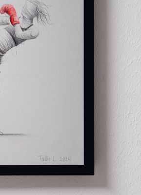 Du kannst die Knickboxerin mit Bleistift skizzieren und mit schwarzem Buntstift die dunklen Bereiche nachzeichnen. So ein skizzenhafter Charakter mit einigen schwungvollen Linien verleiht der Illustration eine gewisse Dynamik. Eine Akzentfarbe, wie hier das Rot der Boxhandschuhe, setzt gezielte Highlights und füllt die Zeichnung mit zusätzlicher Energie.