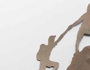 Dieser Scherenschnitt zeigt zwei Wandernde, die sich gegenseitig einen steilen Abschnitt hinaufhelfen – ein ausdrucksstarkes Motiv für Zusammenhalt und Abenteuerlust. Das grobfaserige Kraftpapier verstärkt mit seiner Struktur die raue Anmutung der Felslandschaft. So braucht es nicht mehr als ein wenig Knitterei, um den Berg plastisch erscheinen zu lassen.