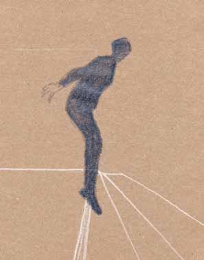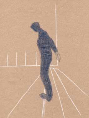 Gesellt sich eine einzige waagrechte Linie zu einer Figur, wird die Linie zu sehr viel mehr als nur einem Strich. Sie erlangt Bedeutung und die Figur einen räumlichen Kontext. Die Linie wird zum Horizont oder zur Gehwegkante, Stange, Wandbegrenzung, zum Seil und vielem mehr, je nachdem, wie sie zur Figur angeordnet ist.