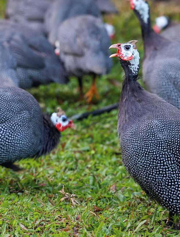 In einem Jahr ließ sich eine Truppe von Perlhühnern auf unserem Grundstück nieder. Sie lernten schnell den speziellen Ruf, mit dem ich sie aus ihren Freilaufabenteuern zurückrief. Wenn sie „Hiiier, putt-putt!“ hörten, kamen sie angewackelt, so schnell sie konnten, um sich ein paar Leckerbissen abzuholen.