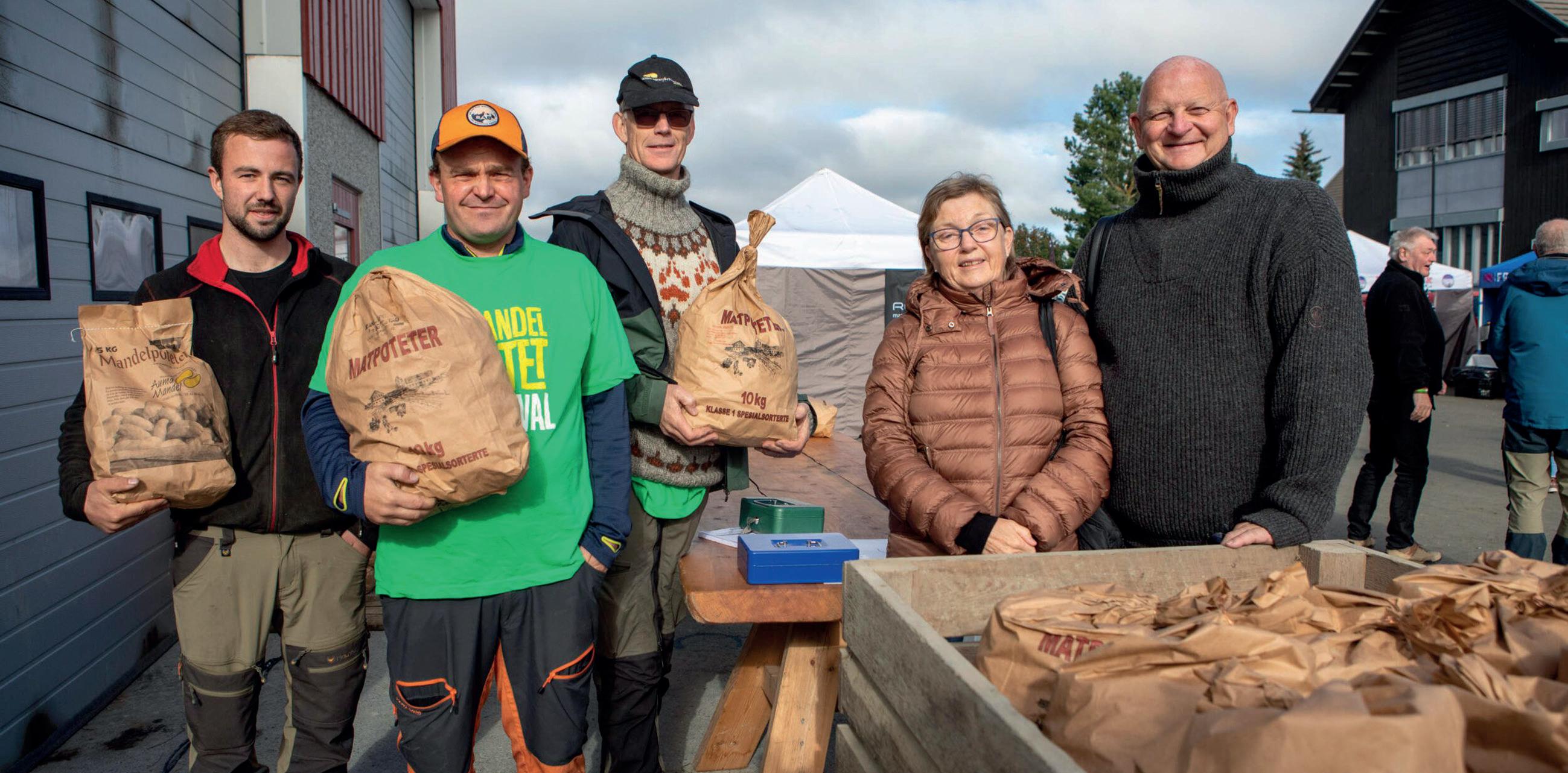SELGER MANDELPOTET: Inge Olav Murud (f.v.), Ståle Eggestad og Eivind Landfastøyen solgte potet på Storsteigen i 2023. Knut Eggestad (t.h) og Kitt Brodal fra Jessheim var innom utsalget. Foto: Lars Vingelsgård