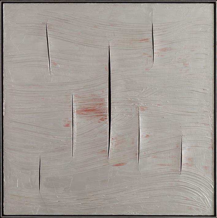 The pioneering artist Lucio Fontana (1899–1968) was born in Argentina to parents of Italian descent. After studying in Italy, he returned to Argentina in the 1920s where he pursued a career as a sculptor. In 1946, he published his Manifiesto Blanco , which called for the integration of art, science, and technology, and laid the foundations for the emergence of the Spatialist movement the following year. Best known for his Concetti Spaziali and Tagli series of slashed canvases, Fontana redefined postwar art by dismantling traditional boundaries between painting and sculpture, questioning the wholeness of the canvas to open up the new and infinite dimension of the void.