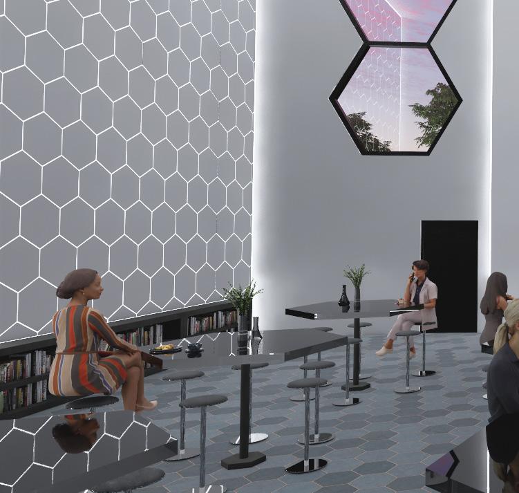 A futuristic lounge organized around a cohesive hexagonal motif... where modular furnishings, illuminated accents, and patterned flooring reinforce a unified design language. Promoting comfort and an engaging user experience