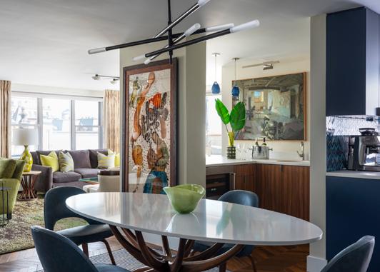 This project was a combination of two apartments into one home in the sky. The walnut chevron floors unify the space with warmth. Custom reeded cabinetry, iron glass work and cleaned lined details add architectural discipline to juxtapose a mix of contemporary and vintage pieces. The client’s collection of Indian art inspired bold color throughout the apartment and adds the final personal touch of which grounds this home in the clouds.