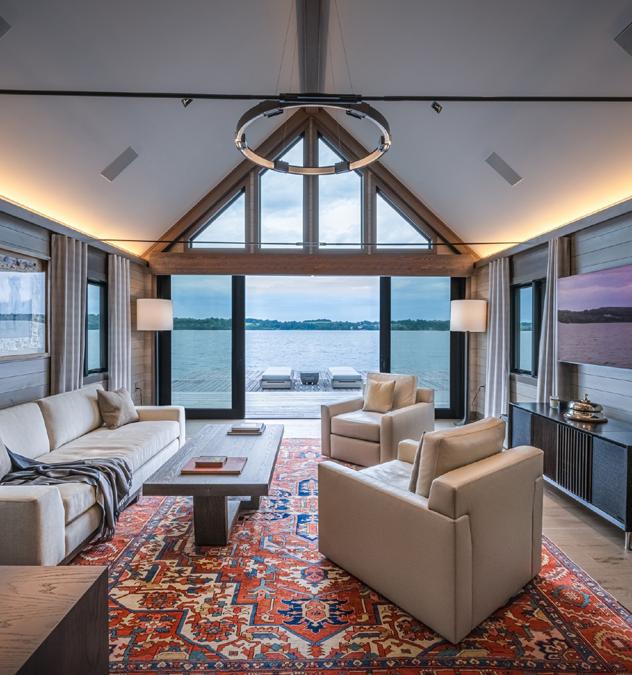 This incredibly rare waterfront estate is one of only four waterfront residences within the nine-home enclave known as The Reed Estate. The magnifcent 8,000+ sq. ft. residence is sited on just over an acre, with more than 120 feet of walk out beachfront and a private four-season private dock. A collaboration between owner and designer has created an efortless, single level indoor / outdoor living experience. Three large en-suite bedrooms and ofce on the main plus a large daylight lower-level fex space (guest suite/gym or media rm) with ¾ bath, kitchenette and foor to ceiling glass doors leading to the pool. Expansive limestone terrace overlooking the rose garden, specimen trees and level lawn. The pool and spa are secluded and surrounded by tall trees, while retaining views of the garden and the lake.