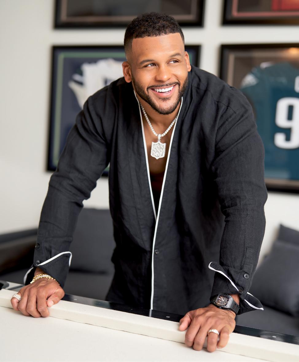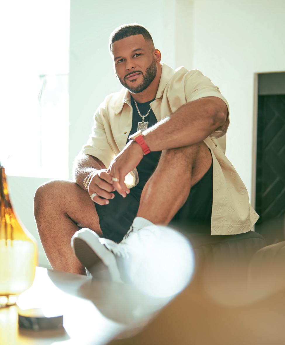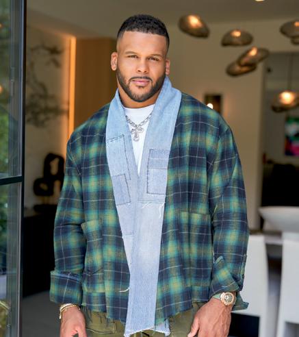 “I’m just grinding,” he says. “I’m coming of of ankle surgery this season, so I’m trying to keep my body in top shape, pretty much training Monday through Friday and sometimes Saturdays. I’m in the weight room, conditioning, making sure that I’m able to move how I need to move. And honestly, I’m in the best shape of my life. I feel like my strength is where it needs to be. I’m trying to stay away from a lot of fried food, sugars, and things that can cause infammat ion, and eat a lot of protein. If I eat certain bad stuf, I just feel like I have to work out. I’ve been doing it for so long that it’s just ment al with me now. I grew up a chubby little kid, and I try as hard as I can not to get back to that chubby little kid. I’m scared of that guy [because] I like to take my shirt of and look good. So, I’m trying to mak e sure that I’m healthy for football, but also for life, period. And right now, my body is looking good.”