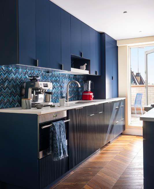 This project was a combination of two apartments into one home in the sky. The walnut chevron floors unify the space with warmth. Custom reeded cabinetry, iron glass work and cleaned lined details add architectural discipline to juxtapose a mix of contemporary and vintage pieces. The client’s collection of Indian art inspired bold color throughout the apartment and adds the final personal touch of which grounds this home in the clouds.