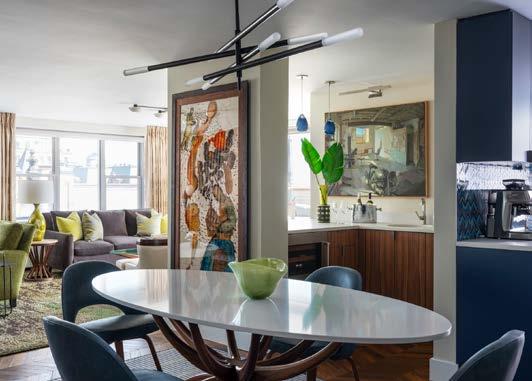 We infused this two-bedroom high-rise condominium with sophistication and timeless glamour. Our clients love hosting friends and family regularly, so we set the stage for elevated entertaining. The geometric media wall commands attention with custom millwork and backlit onyx. Playful geometries continue in the kitchen with mixed materials on the island counter. This fullscope renovation fully transformed the condo overlooking the Chicago River. CI DB provided all the furnishings and decorative lighting for the home, making this a true turnkey project.