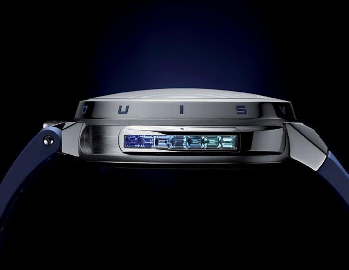 From the inside out, this Tambour radiates elements of outer space, from its futuristic design and complexities to the space storytelling that sits within the dial. Designed as a work of art for the wrist, the dial features a white-gold moving spaceship and miniature planets — both sculpted by engraver Dick Steenman — set against the backdrop of an intricate painting by Anita Porchet of the modern-day space journey. “In order to enhance the relief and depth of space, Porchet combined several techniques such as enamel miniature painting to portray the imaginary planet, opaque and transparent enamels in the nebulae surrounding the stars, [and] antique spangles making the space sky twinkle,” reveals Navas. In addition, the dial is surrounded by the Tambour’s iconic white gold and titanium case, which boasts an impressive 46.8 millimeters, giving a subtle nod to the space capsule and astronaut’s helmet.