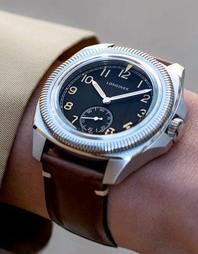 outside of the enlarged, cushion-shaped steel case at 9 o’clock, there is a fitted commemorative plate marked “1935,” a nod to the year the original was manufactured. Another noteworthy update: on the 1935 model, the bezel and crystal with the marker rotated as a unit, but on the new model, the fluorescent “starting time indicator” is displayed under the sapphire glass, from which it is independent, and above the dial. The sapphire crystal glass is fixed in order to adhere to the new case’s water resistance of 100 meters. The dial itself is quite stunning, with the contrast between the matte black dial and the white Arabic numerals coated with Super-LumiNova old radium highlighted by the railway minute marker, ensuring ultimate legibility. At the heart of the timepiece beats the exclusive Longines L893.6 caliber, equipped with a magnetically resistant silicon balance spring. In addition, the movement has a power reserve of up to 72 hours, keeping accurate time even when not worn for a few days.