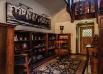 Although upgrades have been made over the 97 years since the home was constructed, many of the original quality materials and fine details of the home remain today. The exterior walls of the Englishstyle home have stucco and brick finishes, as well as half-timbers. The roof is slate. The formal entrance on the west side of the home is two stories high and made of Indiana limestone. Over the front door is a crest bearing a crossed sword and a knight’s helmet. The less formal entrance on the east side of the home overlooks the large lot, which slopes down to Kessler Boulevard below it.