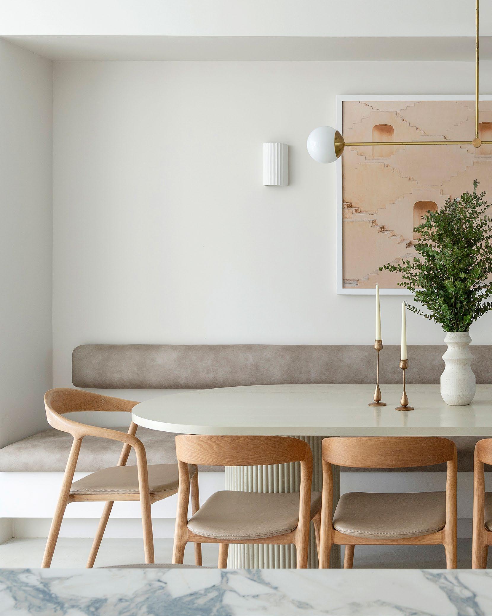 Emma decided on a banquette-style dining space that embraces padded seating on one side, its backrests floating above the seating so as not to dominate the space, and a quartet of chairs on the other. The dining table, oval in shape with substantial circular ribbed legs, was the last piece of the puzzle.