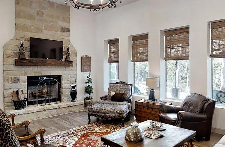 SANCTUARY OAKS-this name elicits all the emotions you will feel as you drive through the gated entry, amongst the massive oaks that create nature’s beautiful canopy around this very special property. Perfectly situated on 5 high fenced acres, you will be visited by deer from sunrise to sunset as they wander among the oaks. From the stone exterior to the modern farmhouse interior, this home is instantly appealing! A wrap around porch with covered alfresco dining under the timbered outdoor space allows you to enjoy many entertaining options. Notice all the extra details such as Edison lighting in the trees, a comfy porch swing, and a separate conversation area under the trees that create a memorable experience for family and friends. As you step up to the front door, you will be invited into a light and bright interior space accented by the floor to ceiling stone wall and fireplace and a lovely vaulted wood ceiling that creates a warm environment. White kitchen cabinets with stainless appliances, some open wood shelving options and a center island, provide ample space for prepping and cooking all your favorite dishes. If you need a home office, study or bonus flex space, just step beyond the main living area into an expansive sunroom flanked by windows on three sides, a stone accent wall and a warm wood detail ceiling. Slate and hardwood flooring are the perfect complements to the modern farmhouse design of this home. If you like to luxuriate, then soak in the claw foot tub in the owner’s ensuite. The second floor is home to two additional bedrooms, bathroom and a loft area with wall-to-wall built-in book shelves. Take a walk over to the 900 square foot multi-purpose building with two and a half bathrooms, a shower and large storage area. The beautiful wood ceilings and large windows mirror the main house on the property. This building offers so many options for those looking to host events or even create a guest house on the property. This is an escape from the ordinary!