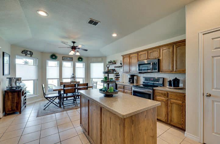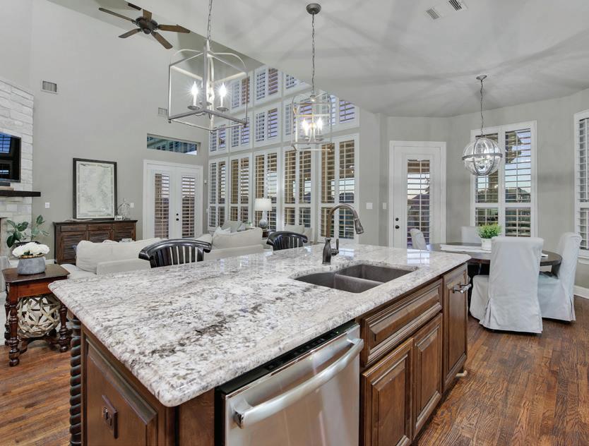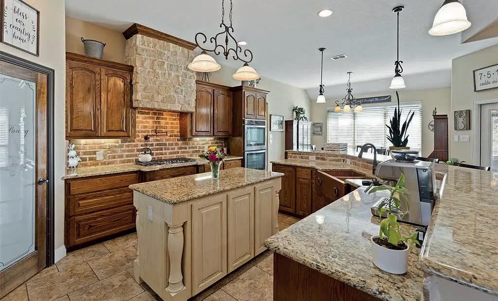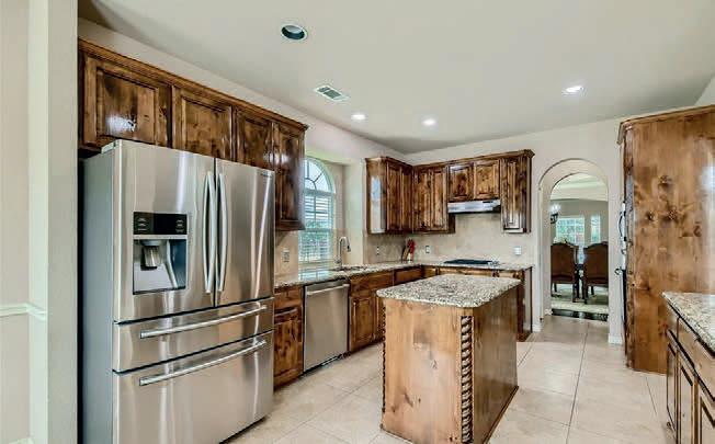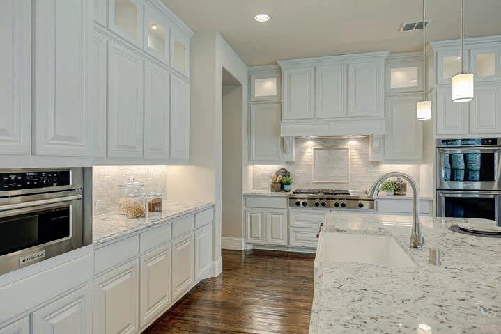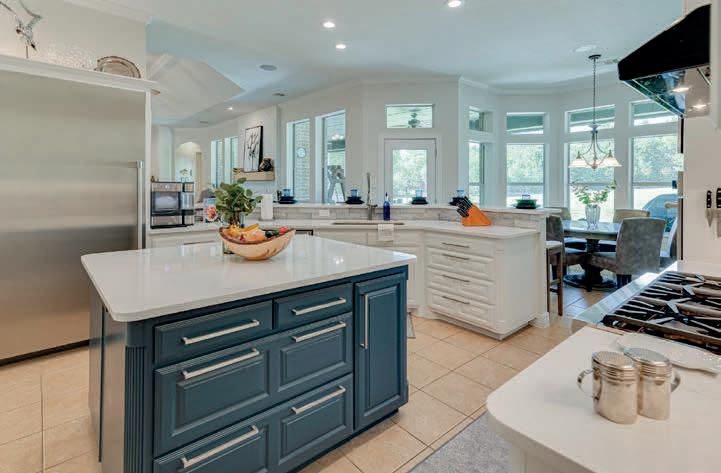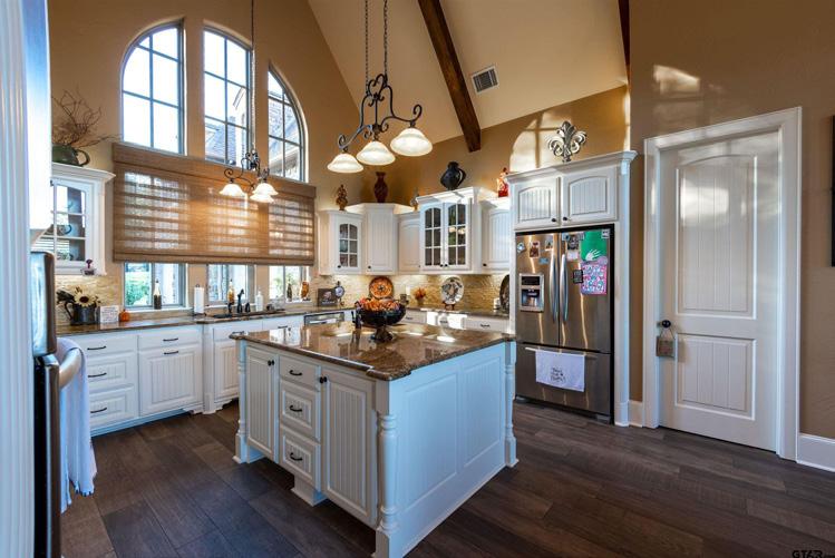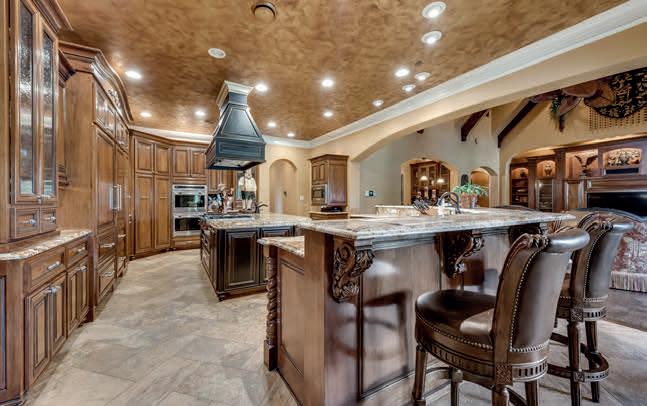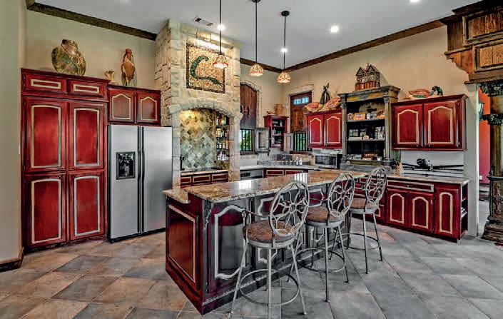 The Kitchen is a chef’s dream come true featuring a stone-accented eating island, separate prep island with built-in mesquite wood butcher’s block and hammered copper prep sink, chiseled edge granite, 6-burner with griddle Wolf gas cooktop, two Wolf brand ovens with convection feature, warming drawer, two Bosch dishwashers and Thermador refrigerator/freezer with hand crafted cabinetry finish, a farmhouse sink and hand-glazed wall finishes. A sizable, walk-in Pantry doubles as a storm shelter offering another