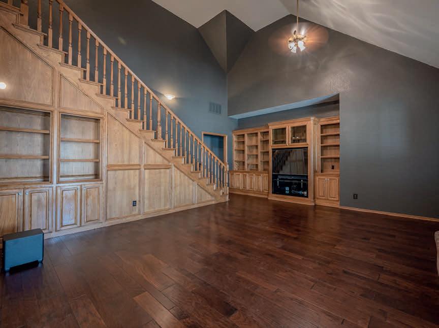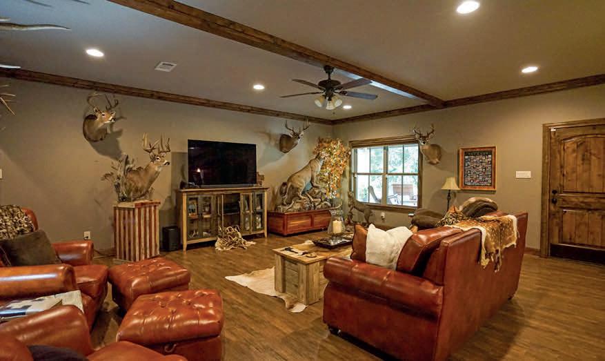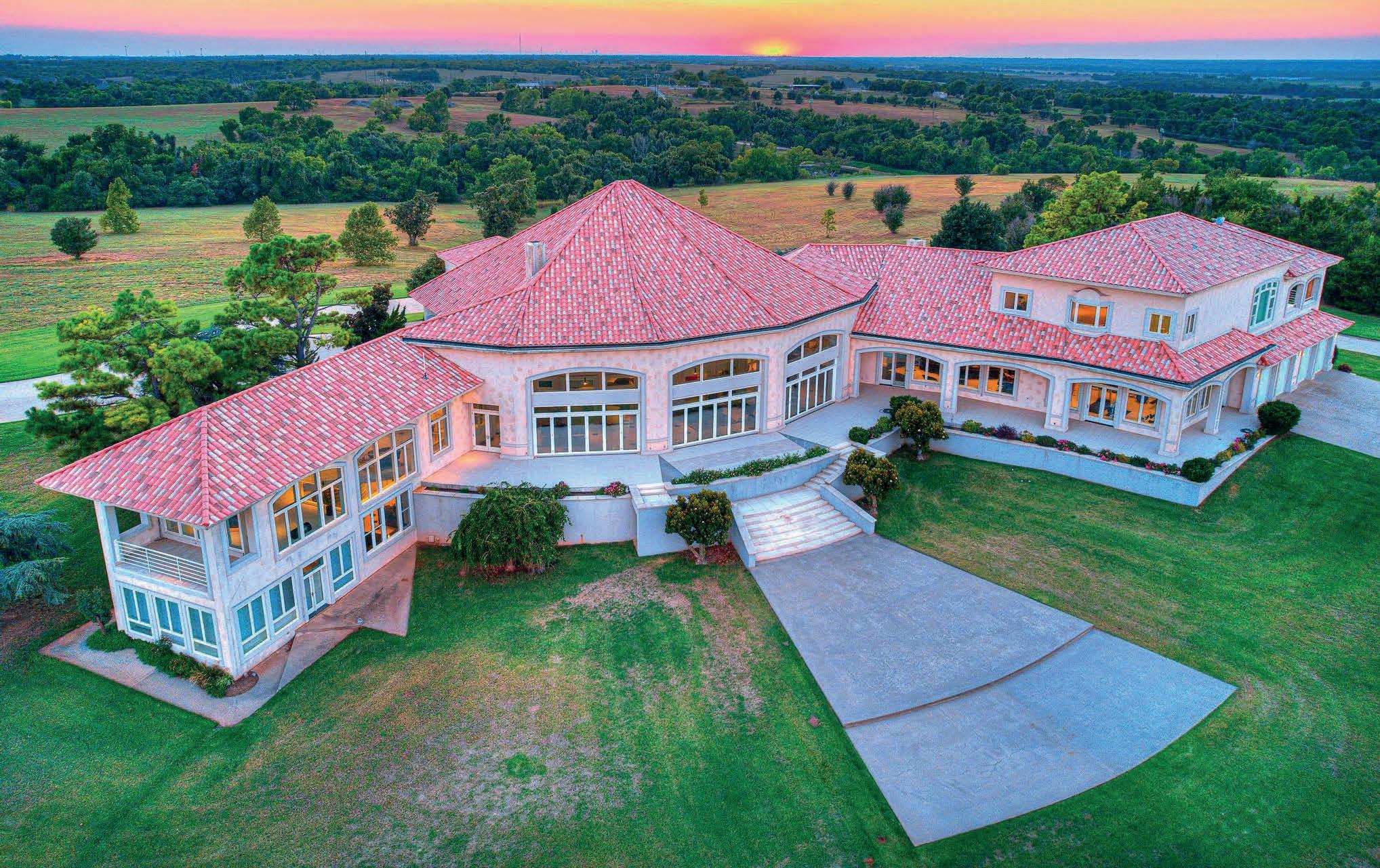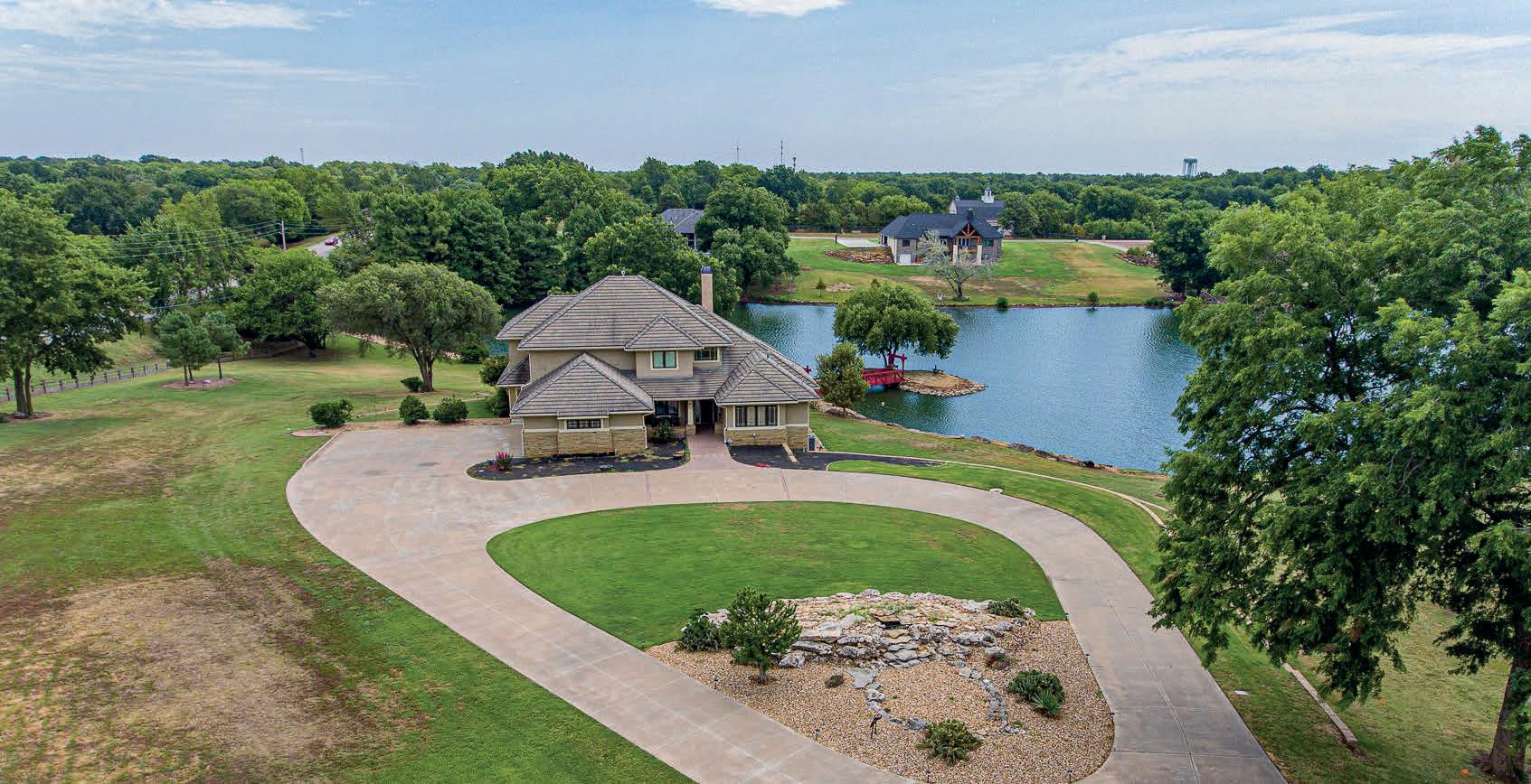 Rustic Lodge Elegance is the ultimate description of this 10-acre estate blending nature’s beauty and luxurious styling in the heart of central Oklahoma. Set behind a private gated entry, the 7400 sq. ft. home, fashioned by Ron Walker Construction and Bruce Ogle Designs, offers the finest in finishes, meticulous planning and incomparable craftsmanship. Remarkable quality greets you in the two-story Entry featuring mesquite wood double doors with iron hardware, a stunning hand-crafted, antler chandelier, hand-scraped white oak wood flooring plus a panoramic view of the beautiful outdoor entertaining area. Thoughtful design leads you to the primary living space of the residence boasting a generous Formal Dining room, Gourmet Kitchen with two bars and bay window Breakfast Dining, and expansive Great Room. The Formal Dining area, flanked by a 1000+ bottle chilled Wine Room and Butler’s Pantry, boasts split leather walls in stamped ostrich pattern, custom antler chandelier and sconces, wood beams and expansive outdoor views.