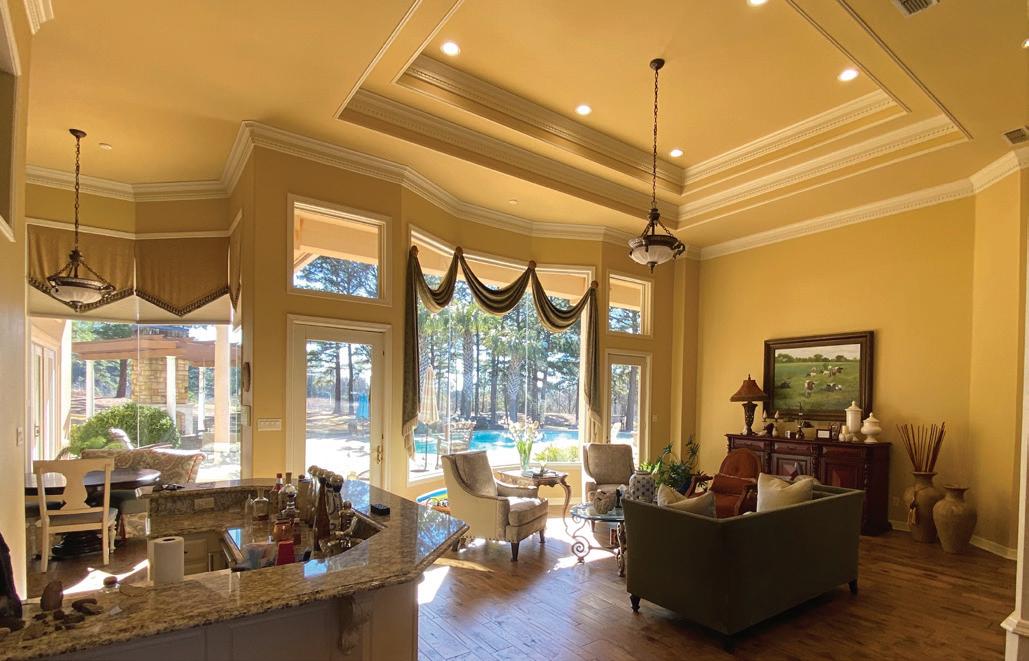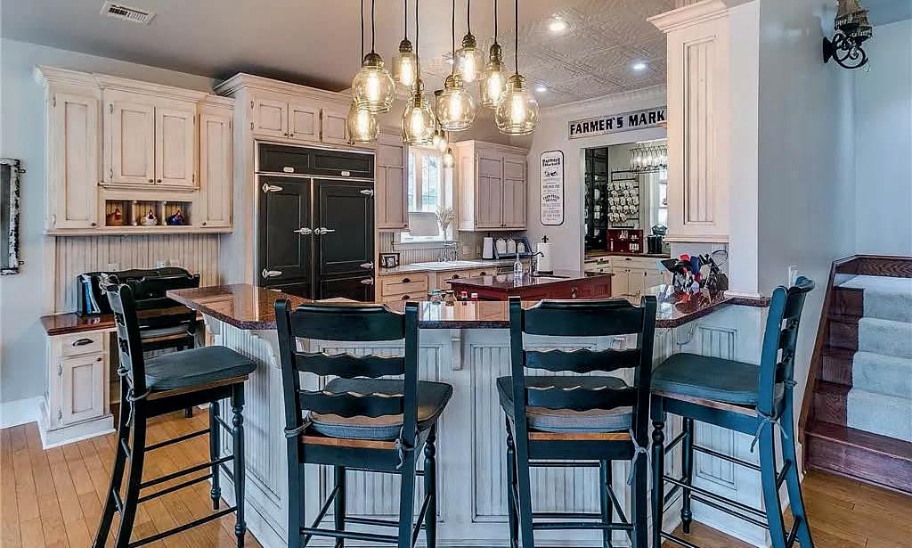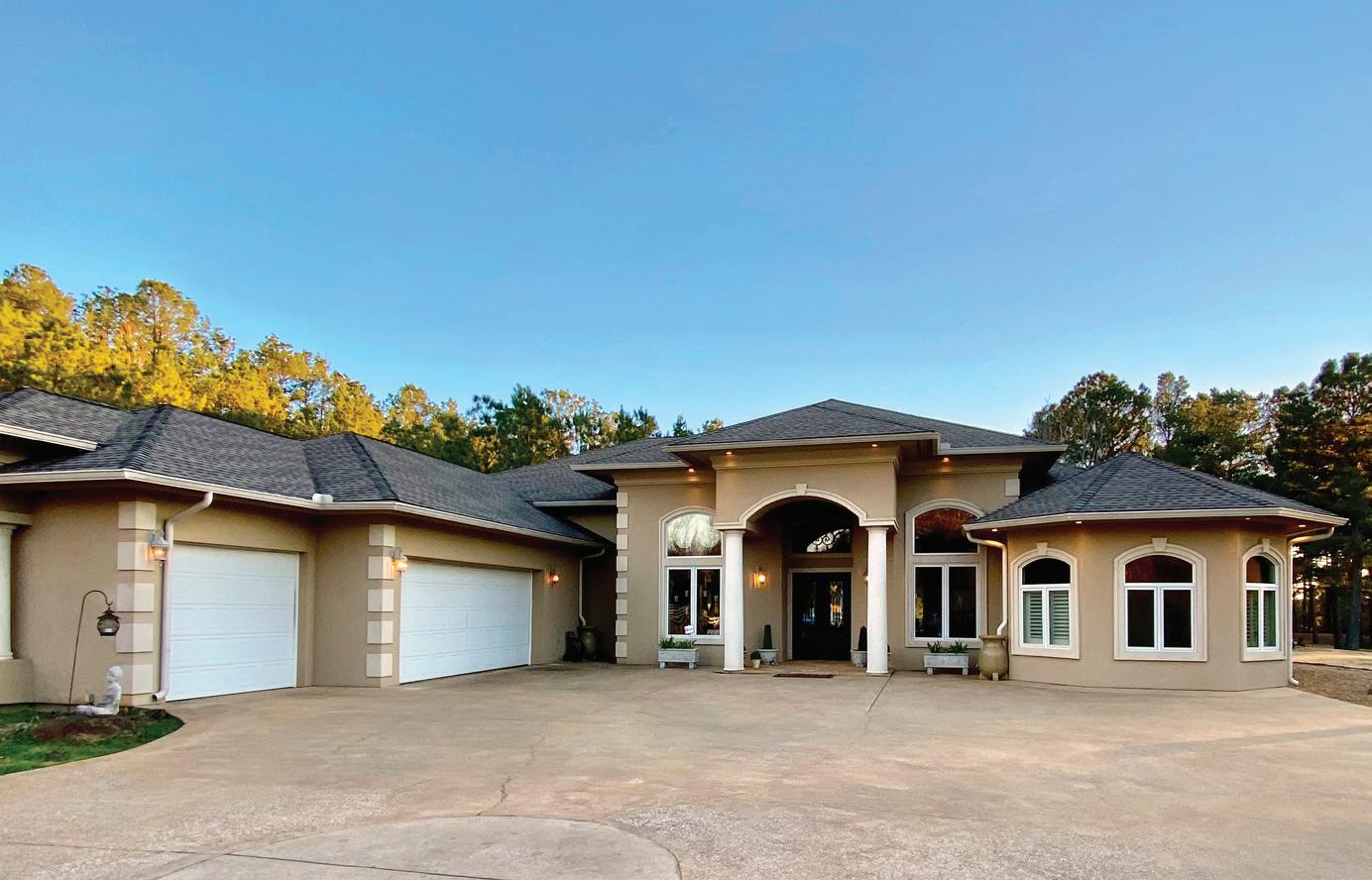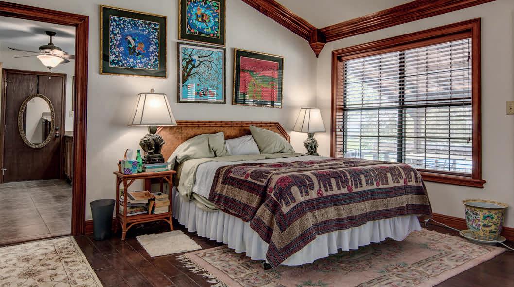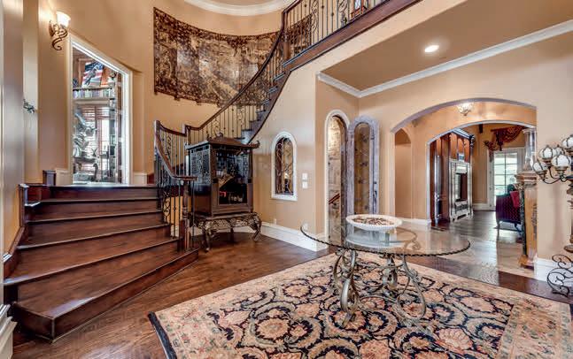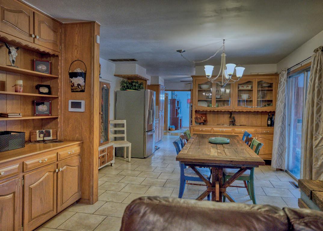 Rustic Lodge Elegance is the ultimate description of this 10-acre estate blending nature’s beauty and luxurious styling in the heart of central Oklahoma. Set behind a private gated entry, the 7400 sq. ft. home, fashioned by Ron Walker Construction and Bruce Ogle Designs, offers the finest in finishes, meticulous planning and incomparable craftsmanship. Remarkable quality greets you in the two-story Entry featuring mesquite wood double doors with iron hardware, a stunning hand-crafted, antler chandelier, hand-scraped white oak wood flooring plus a panoramic view of the beautiful outdoor entertaining area. Thoughtful design leads you to the primary living space of the residence boasting a generous Formal Dining room, Gourmet Kitchen with two bars and bay window Breakfast Dining, and expansive Great Room. The Formal Dining area, flanked by a 1000+ bottle chilled Wine Room and Butler’s Pantry, boasts split leather walls in stamped ostrich pattern, custom antler chandelier and sconces, wood beams and expansive outdoor views.