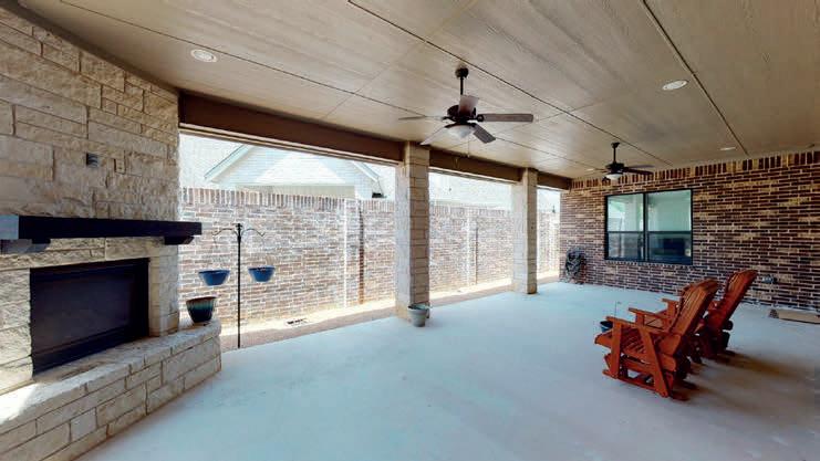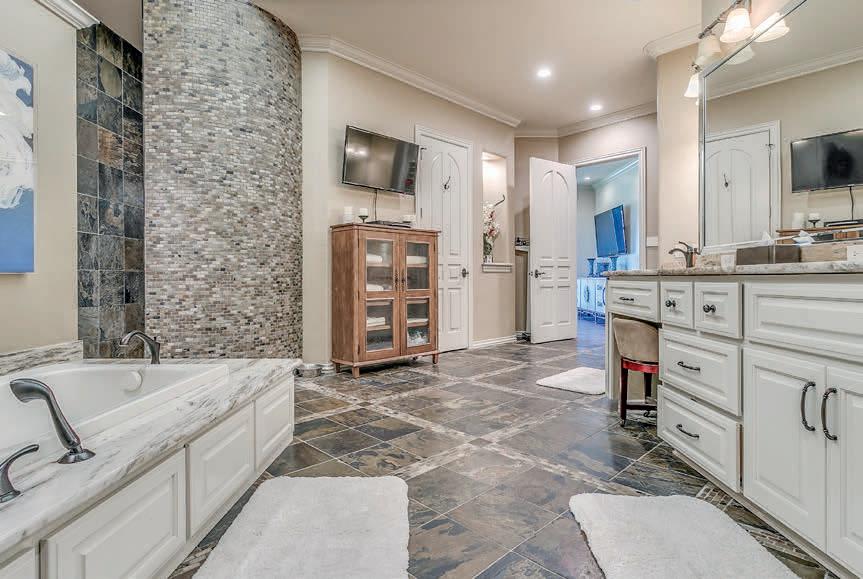 countertops, center island, eating bar, and one food pantry within the room; a larger butler pantry is located in the hall. Primary bedroom + 1 additional bedroom with nearby full bath are downstairs, the other three bedrooms, game room, and 3 full baths are upstairs. Separated Primary bedroom has bay window, door to covered patio, and private luxury bath- featuring a whirlpool tub, separate shower, water closet, and large walk-in closet. Stately office near the front door has 2 beautiful custom pieces of office furniture, which are available for sale. Upstairs, the 3rd bedroom has a private full bathroom and walk-in closet. The 4th and 5th bedrooms share a Jack & Jill bathroom, each bedroom with ample closets. The game room over garage also has a private full bathroom, perfect spot for guests. Large stone patio is partially covered, has fireplace, and overlooks the beautiful fenced yard. Land is fenced, backyard separately fenced with nice rail and black chain fencing. Paved roads.