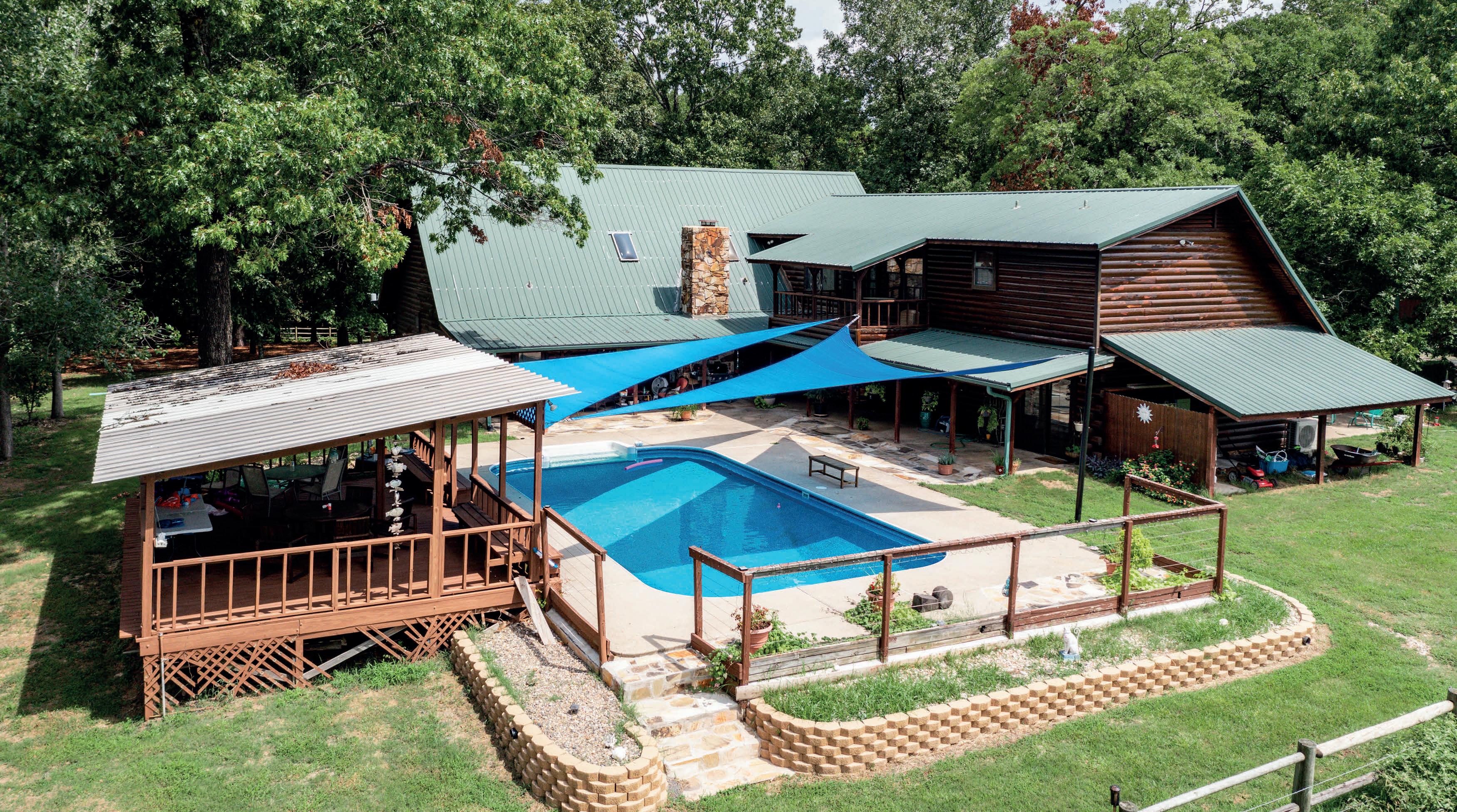 Classic Country estate on completely fenced 12.9 forested acres with magnificent view and total privacy; spacious log home with metal roof, porches, balcony, breezeway and bonus suite; and saltwater swimming pool with pool house; and, +2000 sq ft metal utility building on cement pad. The 3400 sq ft log home (Engstrom Spruce, tonguein-groove) was custom built in 1989 by couple who lived here +25 years, fastidiously maintaining the property. The main living room has a cathedral ceiling and flagstone fireplace capable of heating the entire house with wood from your own forest. Open floor plan with living room flowing into the kitchen separated by a large lunch bar. Kitchen features granite counter tops with island, and generous wood cabinetry. Just off the kitchen is the laundry room; and, across is space for formal dining complete with a bay window, window seat and beautiful lighting. The main floor also has 2 bedrooms and a full bath. The floors throughout are tile. The 2nd floor has an open loft area perfect for games or quiet sitting. Then the master suite offers +374 sq ft bedroom; and, a carpeted walk-in closet with built-in dresser. The ensuite bathroom contains two separate bathroom sinks with separate cabinets; a linen cabinet, a large bathtub; and, a tiled walk-in shower. There is also a gun safe on the second floor. The loft and bedroom have wood floors with tile on bathroom floor. Finally, a