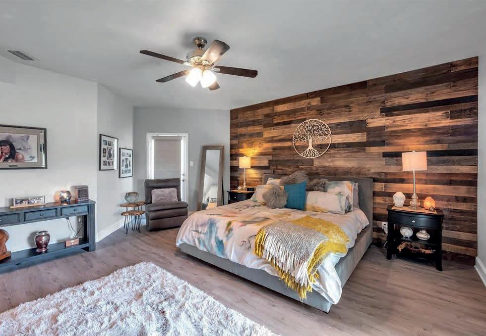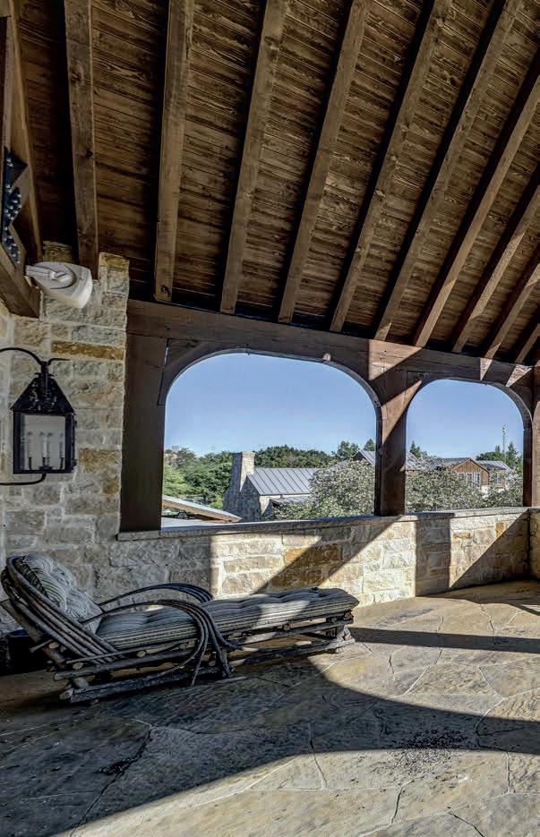 copper, prep sink and terrific storage. Soaring ceilings framed by dramatic wood beams and a two-story, stone fireplace adds natural character to the light filled Great Room. A majestic, cut stone hearth anchors this room with one-of-a-kind features such as 150-year-old reclaimed floor joist used as a custom mantel, splendid antler chandelier and hand pieced wood flooring. The private Study is rich in style with hand crafted mesquite wood wainscoating, leather walls in stamped wrinkle bull hide, stone fireplace with reclaimed western hemlock wood mantel, and custom fire screen with iron antler hinges. Serenity awaits in the Primary Bedroom Suite where you are welcomed by hand-pieced, full-hide leather flooring, panoramic views, stunning antler chandelier and indulgent Bath.