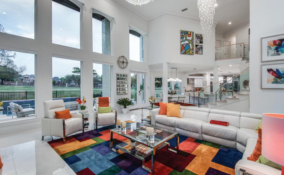 Living room with wall of windows overlooking the lake, oversized fireplace and wine bar
