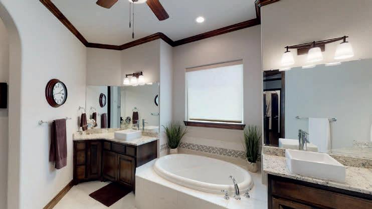 lightly colored granite counter tops, including a closed walk-in pantry. Leading from living room is the hallway going into the large laundry room, full bath, 2 car garage. Completing the lower level is the owners suite w/ spacious bathroom that gives a jacuzzi bathtub, 2 sink areas, walk-in shower, and walk-in closet.