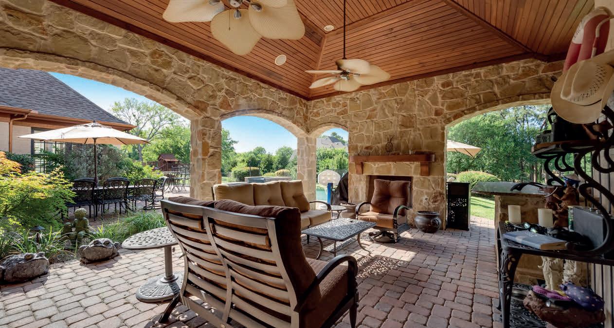 Workout area with rubber gym floor, a massive family Laundry room with double washer and dryer setup, and Hall Tree private entry. Attention to detail continues outside to a multi-level entertaining space with wood burning fireplace, natural gas stone firepit, professional Wolf gas grill and exhaust hood, slate patterned stamped concrete, tongue-n-groove pine wood ceilings and extensive custom landscaping.