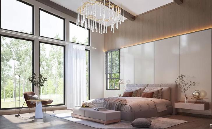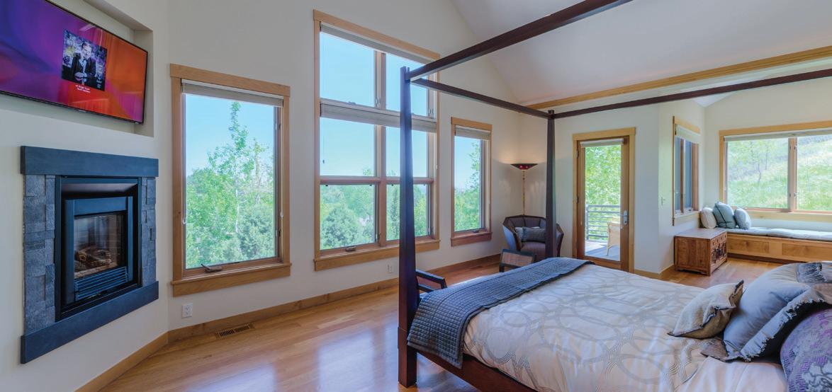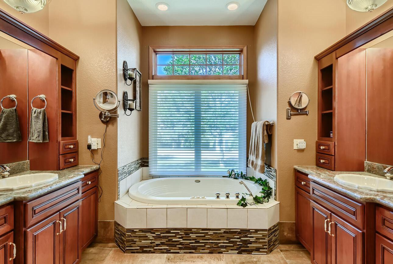 Main floor master suite offers vaulted ceiling, walls of windows, fireplace, spacious sitting area with wet bar, lavish bath, large walk-in closet with windows, adjoining optional laundry room, and private next door office/ study.