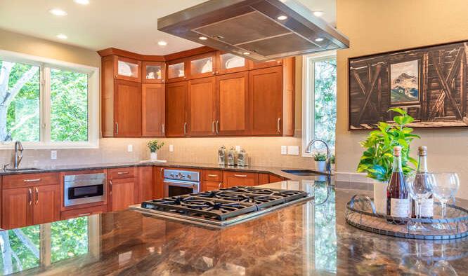With elevator access on 3 levels, the main level includes a great room with vaulted ceiling and two story windows, large deck and fireplace open to the adjacent dining room. Chef’s kitchen offers multiple prep stations, walk-in storage pantry, wet bar butler’s pantry, and a spacious 5-person island. NanaWall glass doors open the space to covered patio, with additional seating and dining areas, fireplace, hot tub, and new outdoor kitchen.