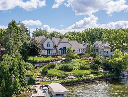 Luxury living at its finest with spectacular lakefront views on Lower Long Lake. Enjoy nearly 8500 sqft of finished living space with 114+ feet of water frontage and extensive outdoor living spaces! Huge living room with gorgeous fireplace, custom built-ins, and vaulted ceiling. The main floor also boasts a large primary suite, formal dining area, 2 offices, a 3-season room, and a laundry room. The gourmet kitchen overlooks the lake and is complete with high-end appliances, granite counters, and a breakfast nook. Radiant heat floors, coffered ceilings and extensive woodwork throughout the home. Elevator access to all 3 floors. Walk-out finished lower level has a 2nd full kitchen, wine cellar, gym with sauna, and 4th bedroom with bath. Heated 4-car garage with EV charger and electronic gated driveway. 24000 kw Generator. Dock and pump house with electricity and water. Beautiful grounds, lake views and the sound of distant bell chimes from Kirk in the Hills. This is truly a special property. Too many features to list. BATVAI.