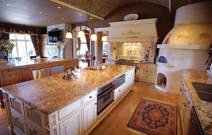 Open floor plan with 7, 000+ sq. ft. of finely appointed living area, vaulted ceilings ranging from 16’ to 20’ in common areas. You are welcomed with 8’ AAW Double Entry Mahogany doors with customized leaded glass; Twin 36” x 30” Crystal Chandeliers on Aladdin Lifts w/6-large scale complementing large scale crystal chandeliers; marble mosaic floor medallion greets you with porcelain/marble flooring contrasted with dark Australian Cypress 4” hardwood throughout; Arches expose the open floor plan leading from the Great Room to the Gourmet kitchen/hearth room; Chef’s double-island kitchen with a baker’s flair; deep chocolate full-overlay, soft-close Maple cabinets with contrasting light granite countertops; 36” 6-burner Viking Professional Range (gas, convection baking, closed range top surface, self cleaning mode) in Merlot/ Brass with matching commercial grade direct-vent Viking Professional exhaust hood; Fully-clad counterdepth 8’ Viking Professional grade Refrigerator single door, bottom freezer drawer; Dedicated electrified stand mixer cabinet.