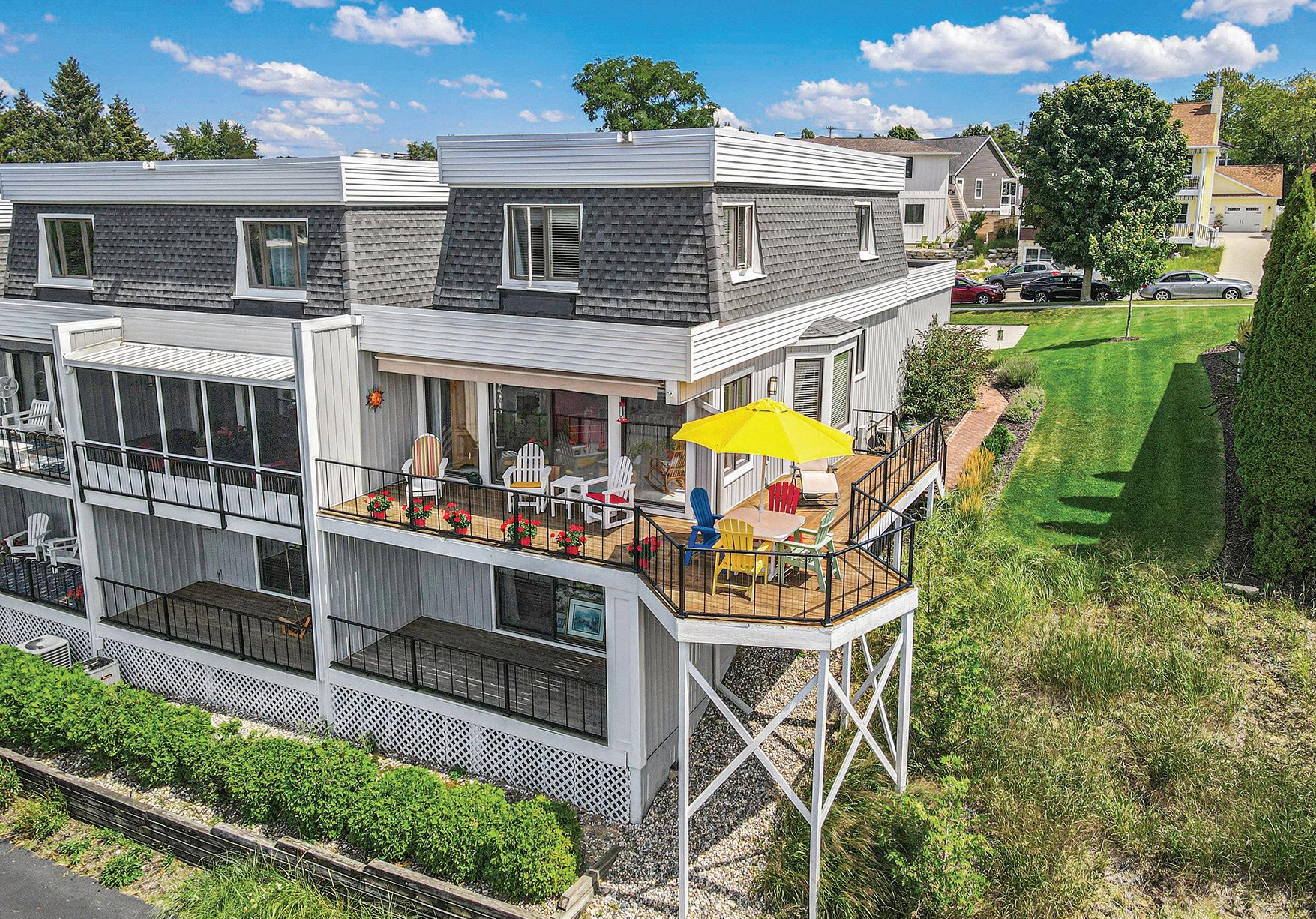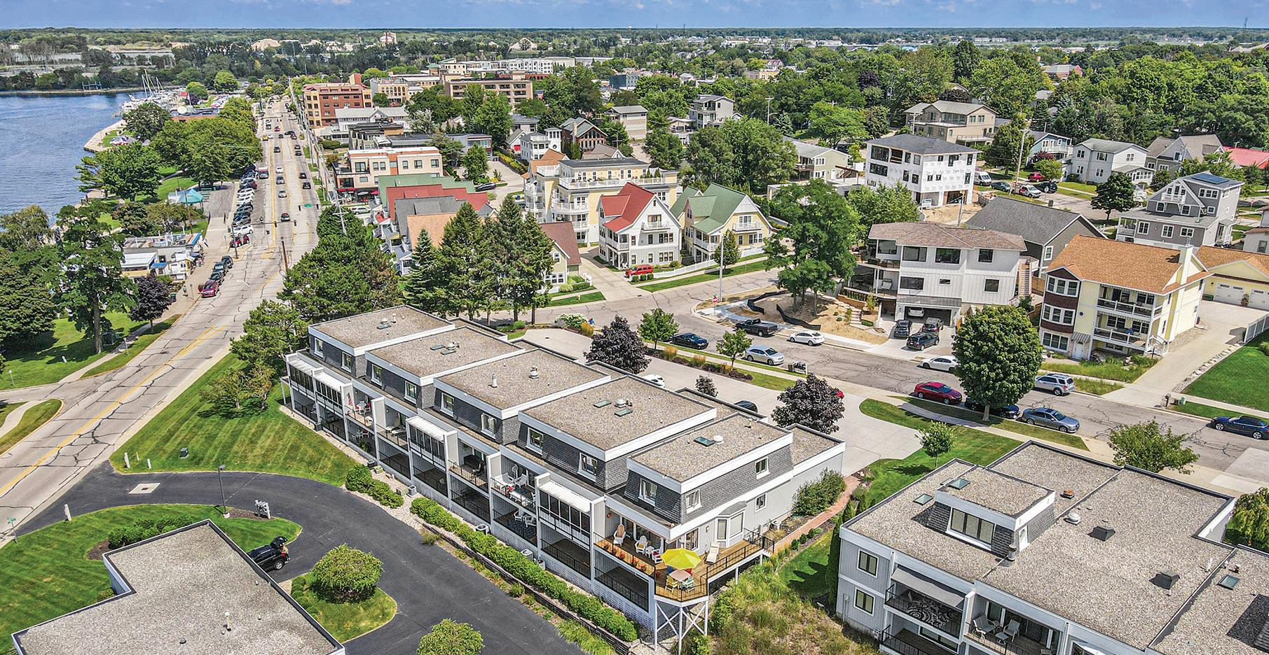 Great location in downtown Grand Haven with a fantastic view looking right down the harbor! Walk to the YMCA, pickleball courts, beach, restaurants and more! This end unit is light, open and full of windows looking out to the Harbor and Lake Michigan. Three levels of living space offer room to make it a 3 or 4 bedroom home. The kitchen opens to a dining area and living room. The wrap around deck boasts stairs leading to the side yard and a remote operated awning for shade on sunny afternoons. The upper level features primary suite and den/study. The lower level is complete with family room/bedroom, full bath and sliders to the lower deck. Laundry and storage room finish off the lower area. The garage is finished nicely with room for bicycles and beach toys. Don’t miss this opportunity to live downtown!