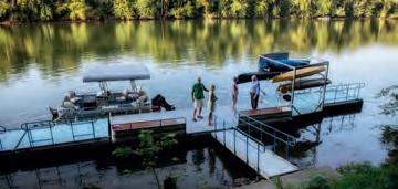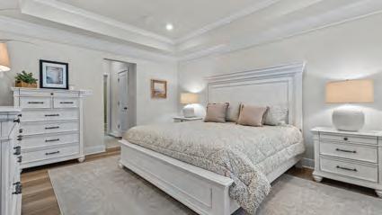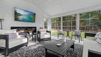 Outdoor spaces are designed for both relaxation and entertaining, including a private upper deck off the primary suite, a screened lower-level porch, a hot tub terrace with an outdoor shower, and an open-air lakeside terrace, each offering stunning lake views. Thoughtful outdoor lighting is incorporated throughout to enhance ambiance while protecting the night sky. The main-level accessible suite includes supportive features such as grab bars, a roll-in shower, a roll-under sink, and thoughtfully positioned light switches throughout the home. A heated, zerothreshold front entry and an ADA-compliant gravel path leading to the dock, where a safety handrail ensures secure, barrier-free access.