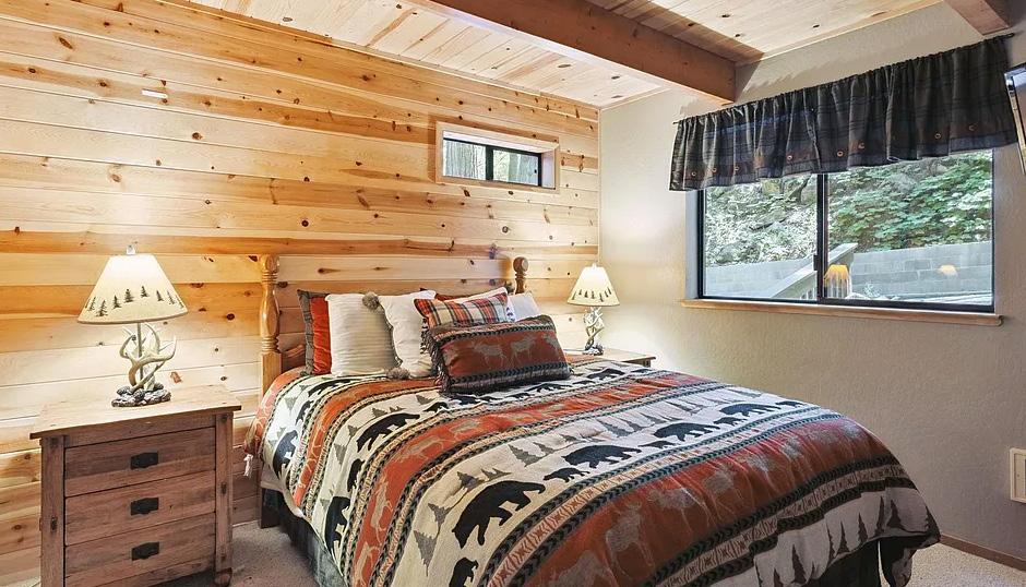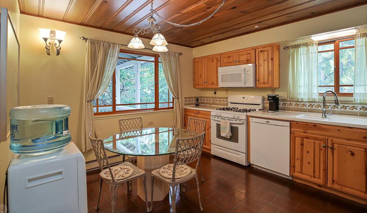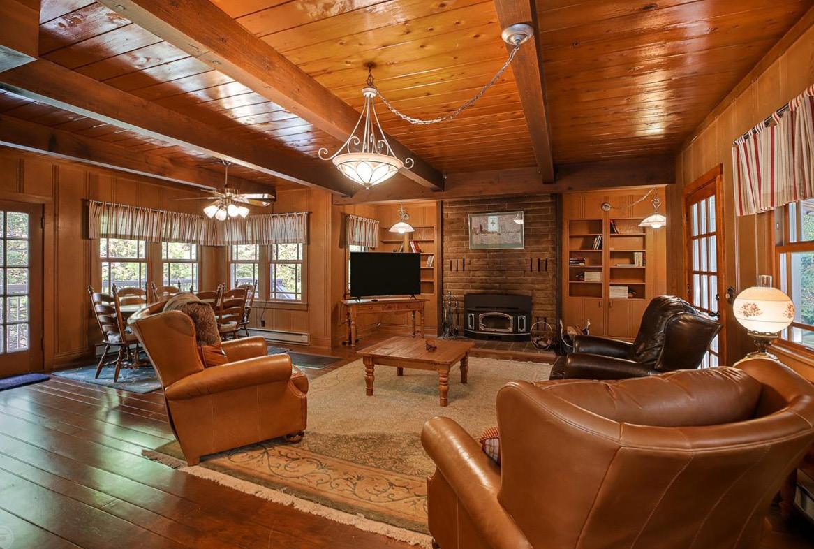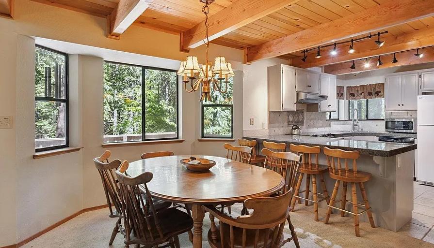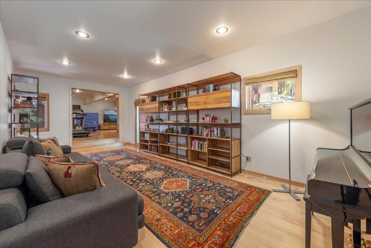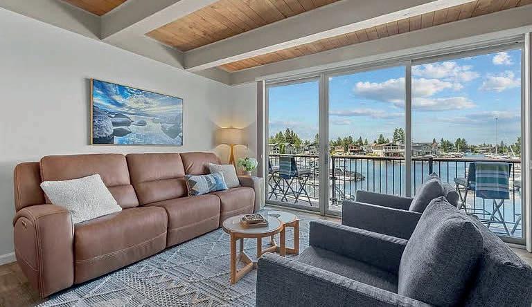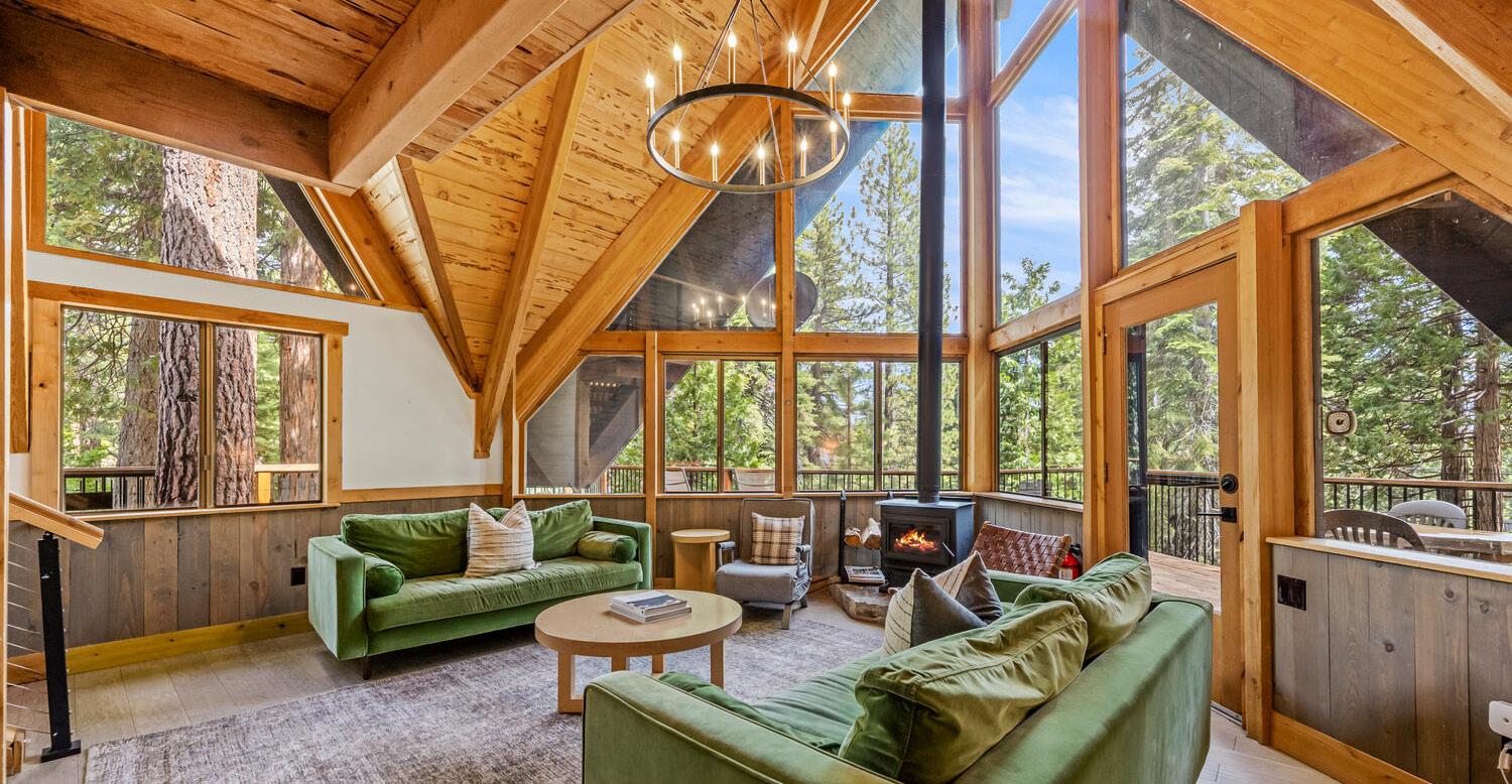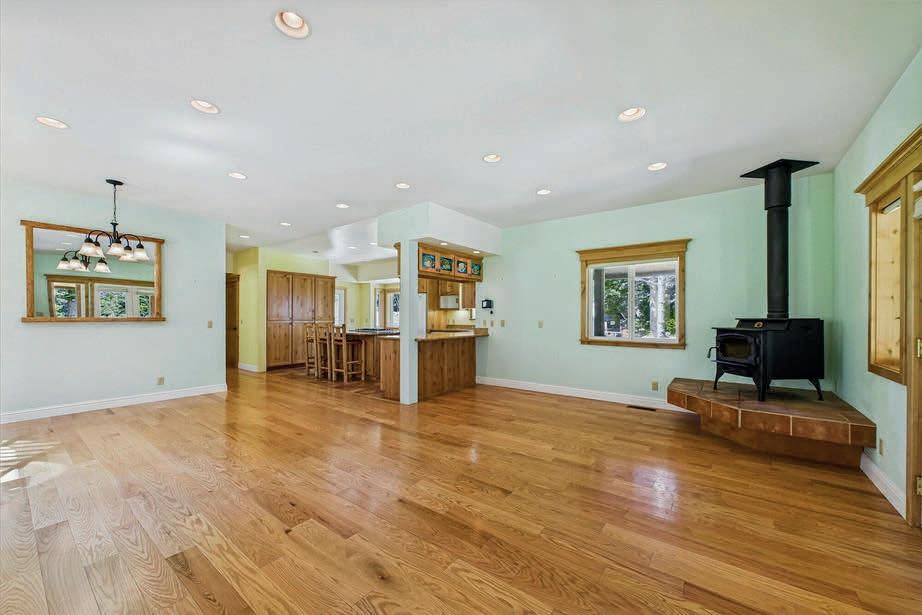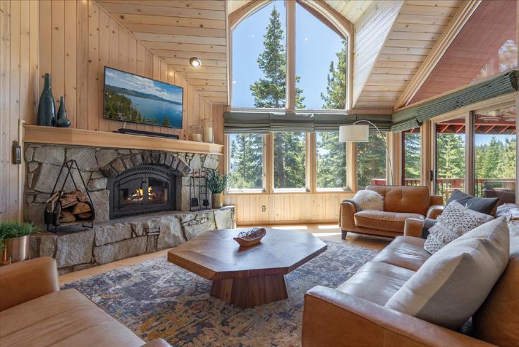 Radiating classic Old Tahoe charm, the home captures breathtaking views from nearly every room. Lovingly held and cared for by the same family since 1969, it exudes warmth, history, and understated elegance. The inviting living room, anchored by a traditional rock fireplace and accented with a built-in library wall, is bathed in natural light from expansive windows that frame panoramic lake and garden vistas.