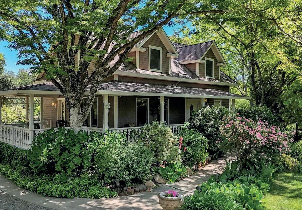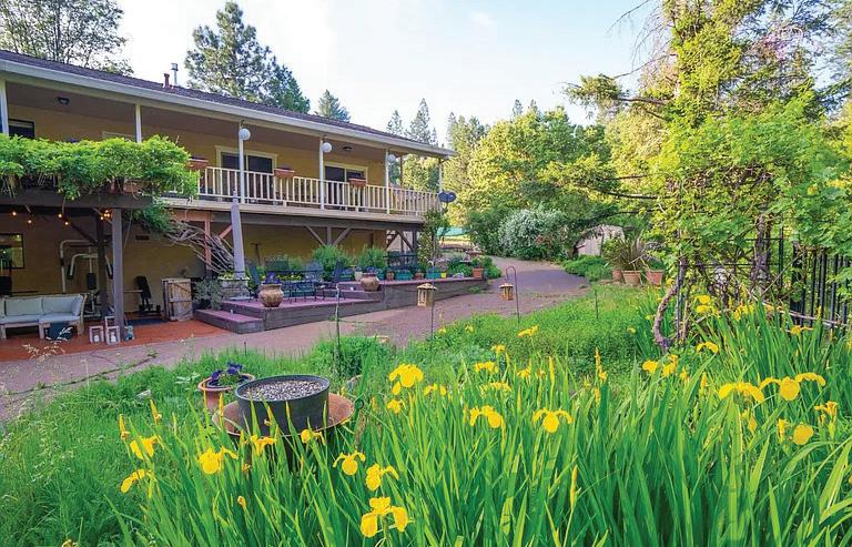 A Private, Magical Oasis Like No Other.Tucked away on 5 breathtaking, fully fenced acres, this immaculate farmhouse offers a rare blend of charm, serenity, and vibrant natural beauty. Formerly owned by the founders of a national organic farm and garden supply company, the property features premium organic plantings, colorful landscaping, and a tranquil koi pond. Enter through an electric gate and wind up a gentle driveway framed by lush blooms and mature trees. The 3-bedroom, 2-bath home exudes warmth with a wraparound porch, hardwood floors, and timeless finishes. The light-filled living room offers a cozy fireplace, while the spacious kitchen boasts marble countertops and custom cabinetry. Grounds include fruit trees, flower-covered arbors, storage sheds, irrigation, and a strong well. Truly magical!